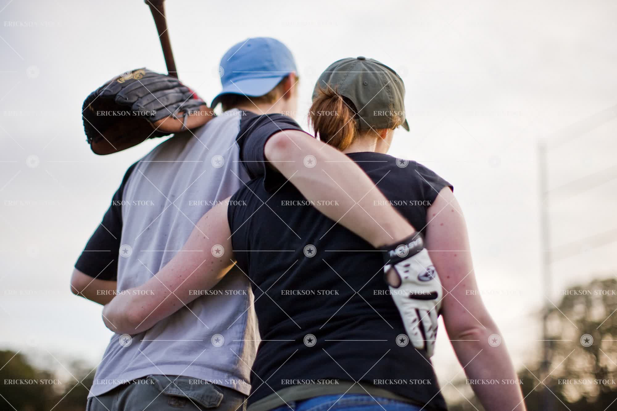 Tags adult, affectionate, arm around, back, back view, baseball, baseball bat, baseball cap, baseball field, baseball glove, cap, caucasian, couple, day, equipment, female, game, games, half length, happiness, happy, hat, hats, heterosexual couple, heterosexual couples, horizontal, leisure, leisure activities, leisure activity, leisurely, low angle, low angle view, male, man, outdoor, outdoors, outside, partner, people, person, playing field, playing fields, rear, rear view, recreation, recreational pursuit, recreational pursuits, relationship, relationships, selective focus, softball, softball bat, softball bats, softball field, softball fields, softball mitt, softball mitts, softball pitch, softball pitches, sport, sport equipment, sport field, sport fields, sporting equipment, Sports, Sports equipment, teenager, together, togetherness, two people, waist up, woman, young adult