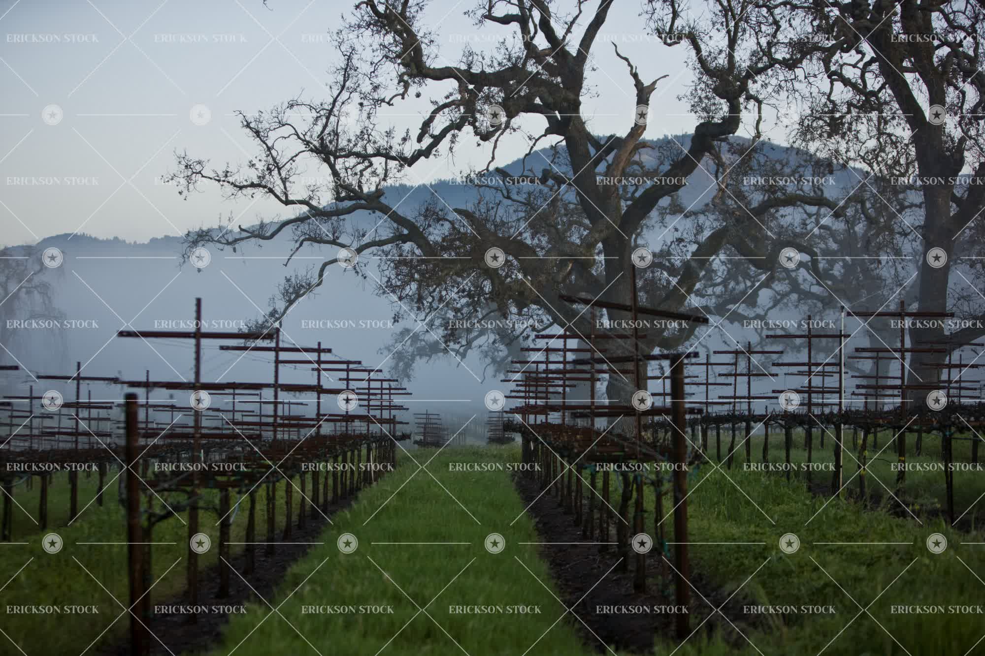 Rows of grapevines in between scraggy trees in a remote vineyard outdoors on a foggy day.