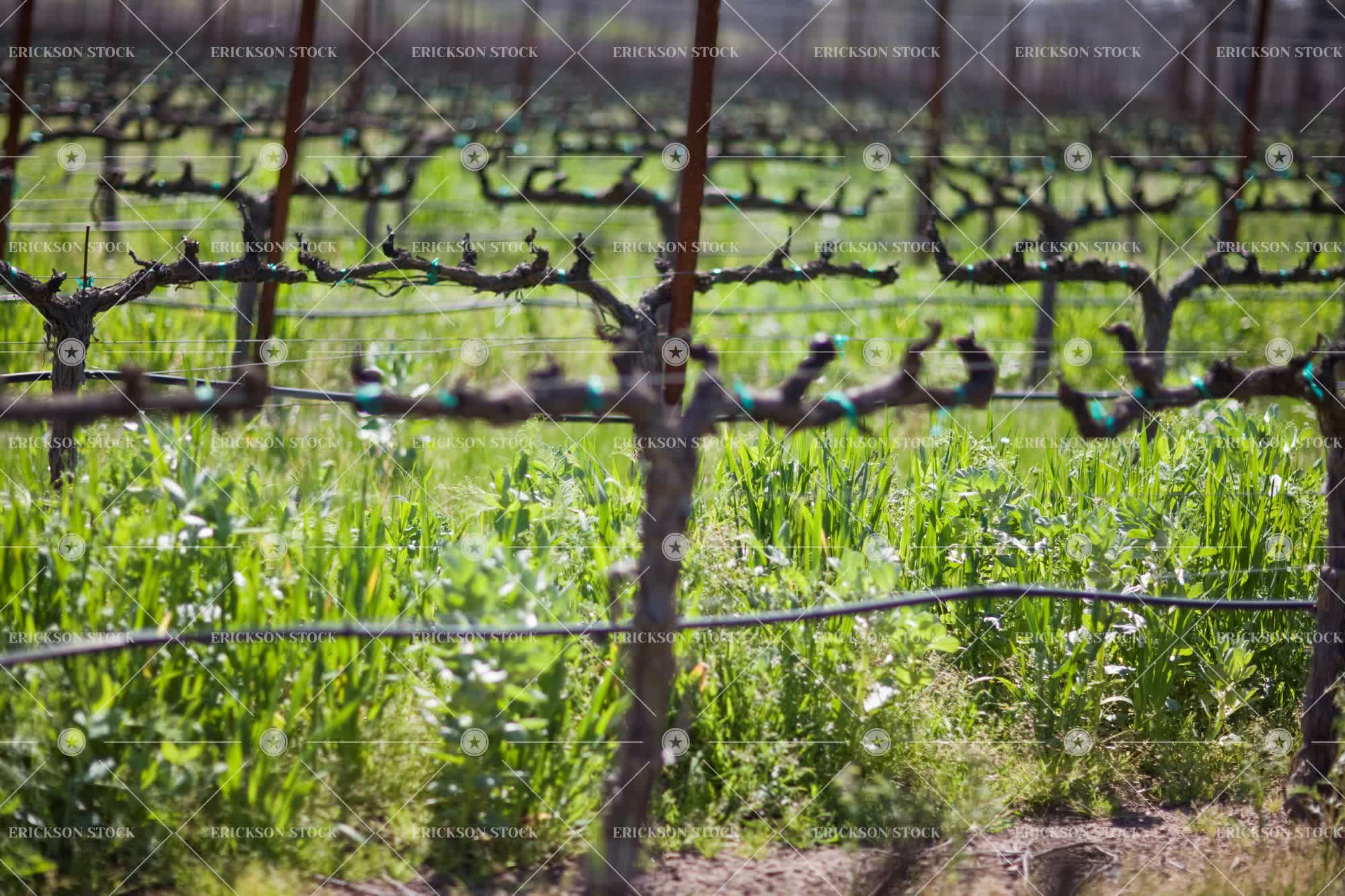 Rows of grapevines in a remote vineyard outdoors in the sunshine.