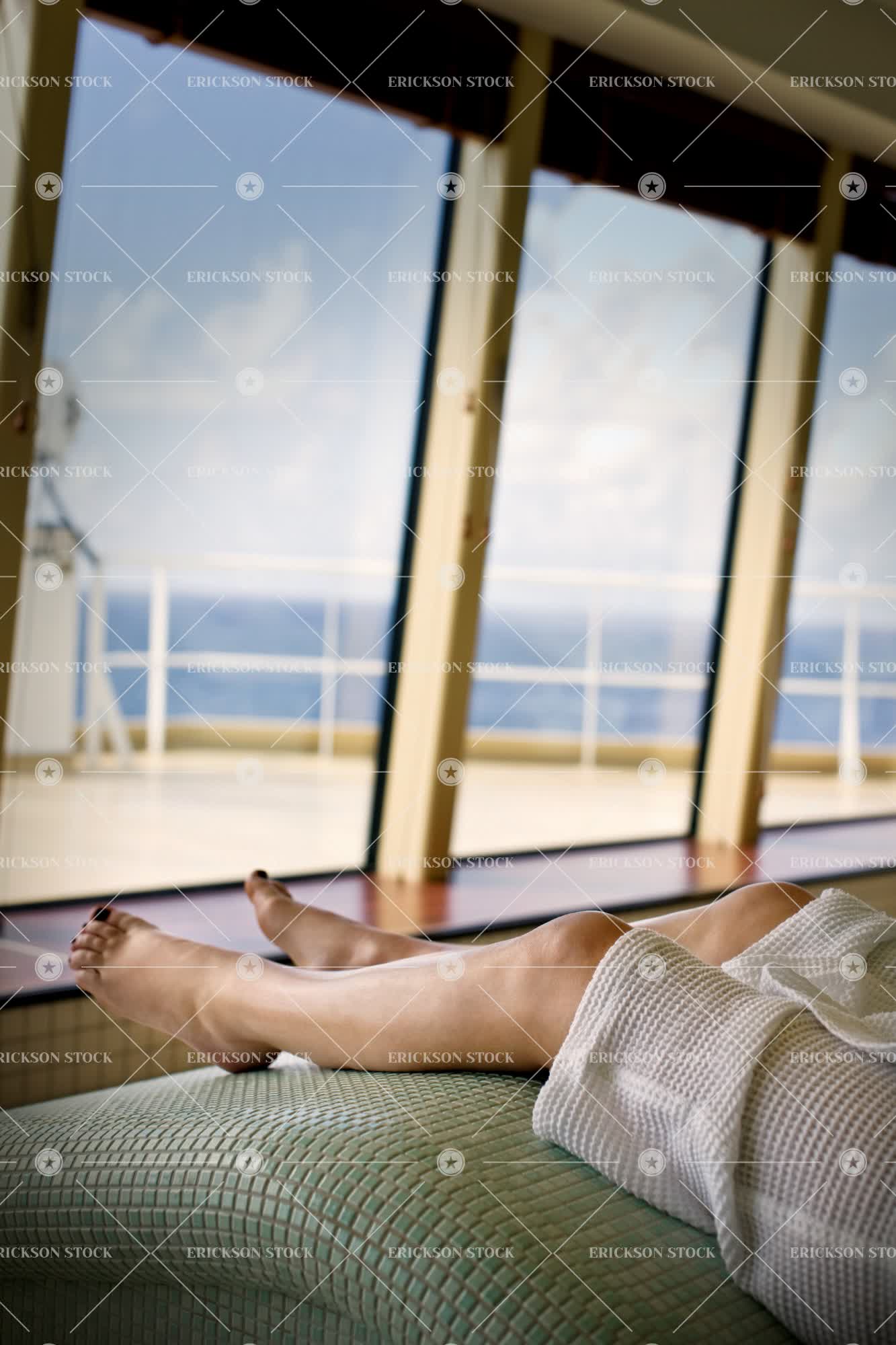 Legs lying on a sunbathing chair in the cabin of a ship.