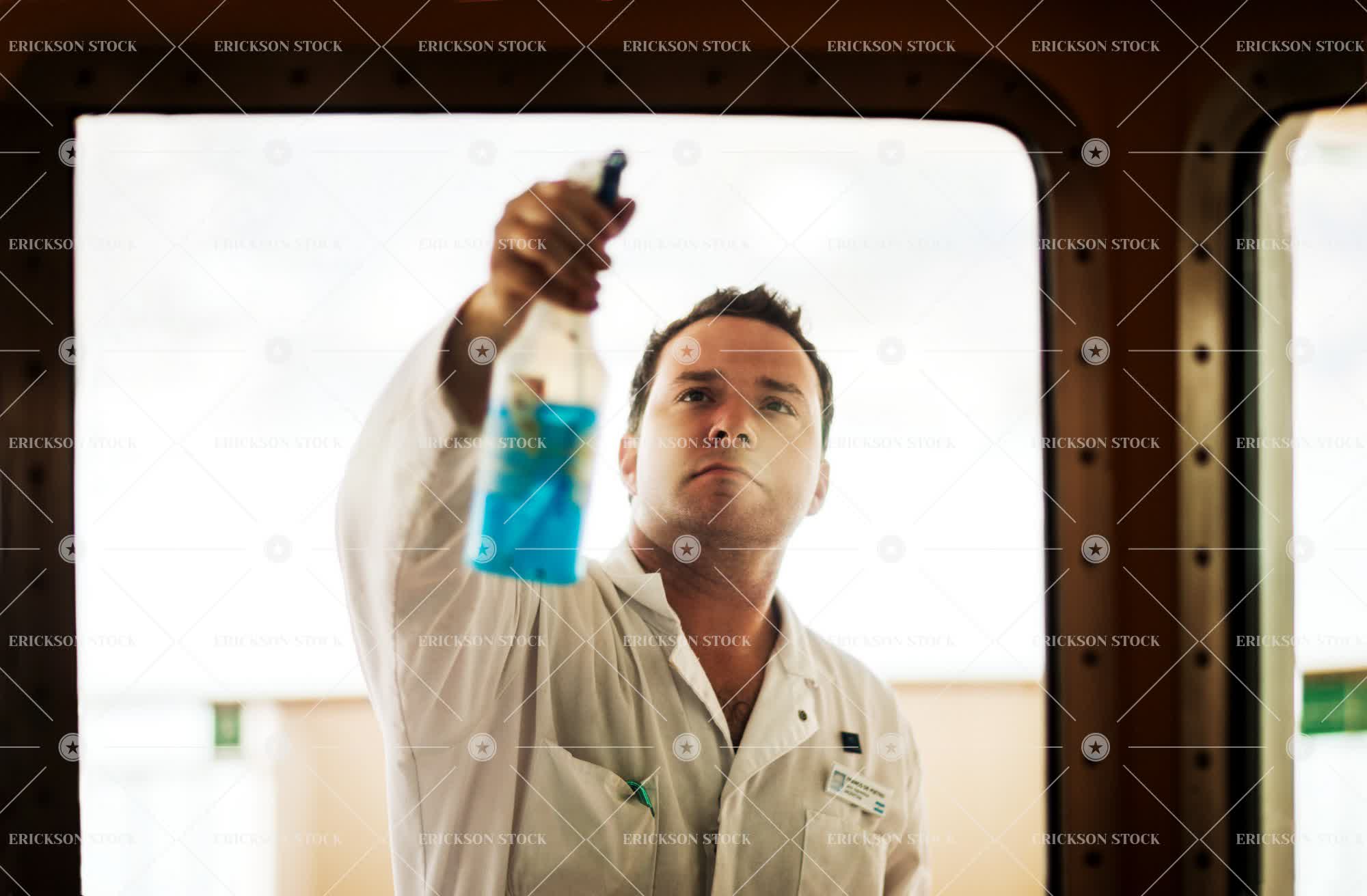 Tags adult, adventure, badge, blank expression, boat, bottle, brunette, button down shirt, caucasian, clean, collared shirt, concentrate, crew, cruise, day, focus on foreground, half length, holiday, holidays, horizontal, indoor, indoors, inside, job, jobs, journey, journeys, look up, looking up, male, man, mid adult, name tag, nautical vessel, nautical vessels, occupation, occupations, one person, people, person, place of work, selective focus, ship, ships, shirt, shirts, splash, splashes, splashing, spray, spray bottle, spraying, sprays, staff, staff member, tourist destination, tourist destinations, Transportation, travel, travel destination, travel destinations, travelling, uniform, uniforms, Vacation, vacations, voyage, voyages, waist up, water, window, window cleaner, windows, work, working