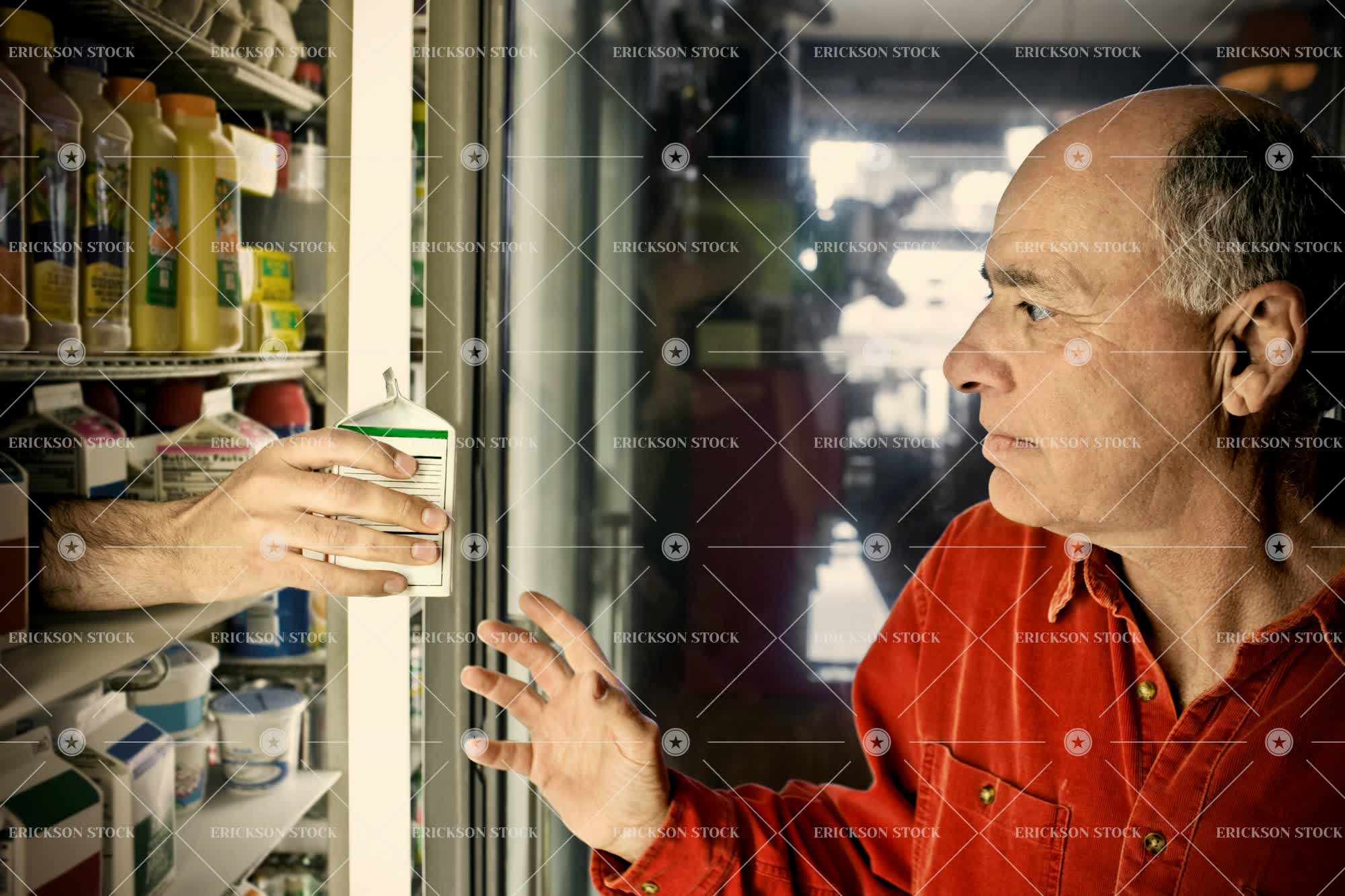 Tags adult, assist, background people, bald, balding, box, button down shirt, casual clothes, caucasian, choose, collared shirt, confusion, convenience store, day, frame, framed, fridge, fridges, gray hair, grey hair, groceries, grocery, grocery store, grocery stores, half length, hand, handing, Hands, help, helping, helping hand, helps, hold, holding, holds, horizontal, human hand, human hands, Humor, humorous, humour, humourous, indoor, indoors, inside, juice, juice box, male, man, marketing, mature adult, mercantile, mid adult, milk, milk box, one person, out of context, passing, people, people in the background, person, profile, receding, receding hair, receding hairline, refridgerator, refridgerators, refrigerator, refrigerators, service, shelf, shelves, shirt, shirts, shop, shopping, shops, Side view, stand, standing, store, stores, suggestion, surprise, surprises, surprising, surreal, vignette, waist up