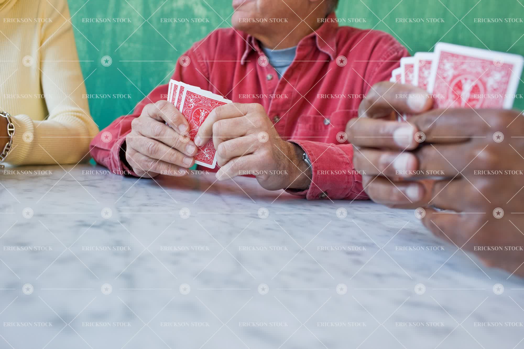 Tags adult, african american, button down shirt, card, card game, casual clothes, caucasian, collared shirt, companion, copy space, copy space bottom, cropped, day, enjoyment, female, friend, friends, friendship, gambling, game, games, green, Hands, happiness, happy, hobbies, hobby, hold, holding, holds, home, homes, horizontal, house, houses, indoor, indoors, inside, leisure, leisure activities, leisure activity, male, man, marble, marble table, marble tables, mature adult, mid adult, midsection, negative space, negative space bottom, part of, people, play, Playing, playing card, playing cards, plays, poker, recreation, relax, Relaxation, relaxed, relaxes, relaxing, selective focus, shirt, shirts, sit, sitting, smile, smiles, smiling, surface level, table, Tables, talk, talking, talks, together, togetherness, unrecognizable people, unrecognizable person, woman