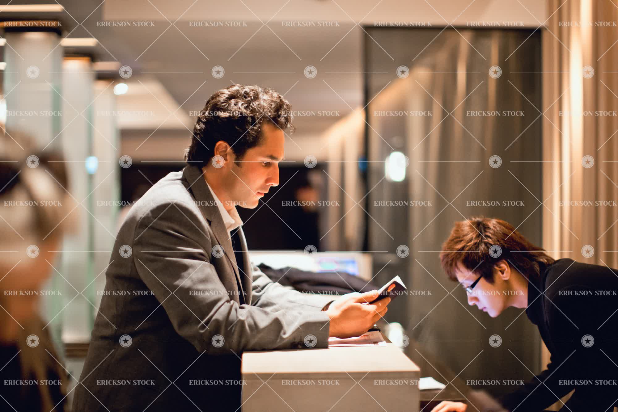Tags accommodation, adult, arrival, arrive, asian, brunette, business, business man, business travel, caucasian, check in, concentrate, executive, executives, eyeglasses, glasses, half length, head, head & shoulders, head and shoulders, head shot, headshot, hold, holding, holds, horizontal, hotel, hotel reception, hotels, indoor, indoors, inside, keyboard, lean, leaning, leans, leisure, leisure activities, leisure activity, lobbies, lobby, look down, looking down, male, man, mid adult, passport, passports, people, person, profile, read, reading, reception, recreation, recreational pursuit, recreational pursuits, selective focus, service, shoulders, Side view, spectacles, stand, standing, stands, suit, tourist destination, tourist destinations, travel, travel destination, travel destinations, two people, type, types, Typing, typing on keyboard, waist up, well-dressed, young adult