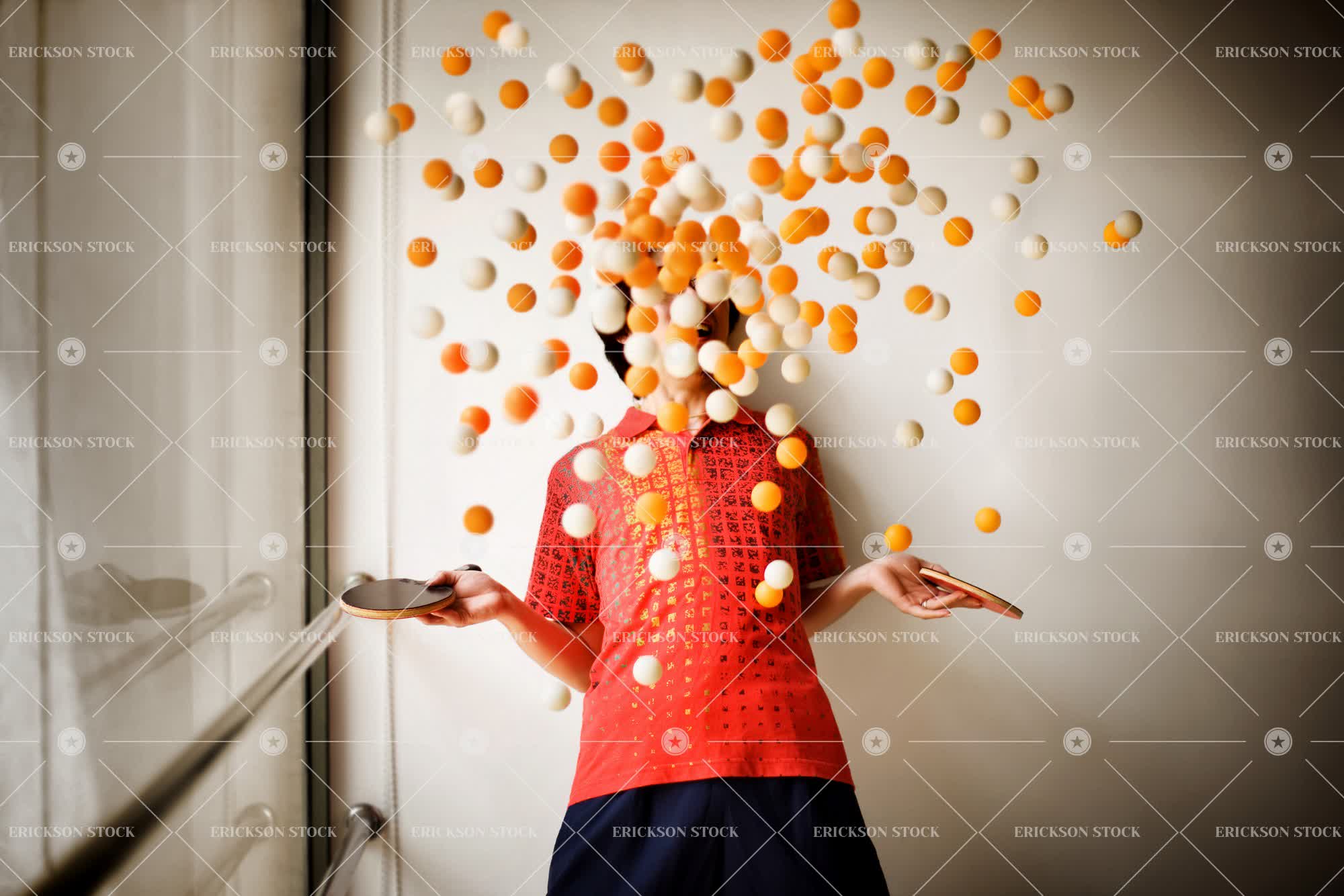 Tags abundance, ball, confusion, covered face, day, face covered, face obscured, fall, falling, hold, holding, horizontal, indoor, indoors, inside, juggle, juggling, management, multi-tasking, obscured face, one person, organization, overwhelmed, overwhelming, people, person, ping pong ball, ping pong balls, ping pong racket, ping pong rackets, sport, Sports, sports clothing, sportswear, stand, standing, table tennis ball, table tennis balls, table tennis racket, table tennis rackets, three quarter length, unrecognizable people, unrecognizable person