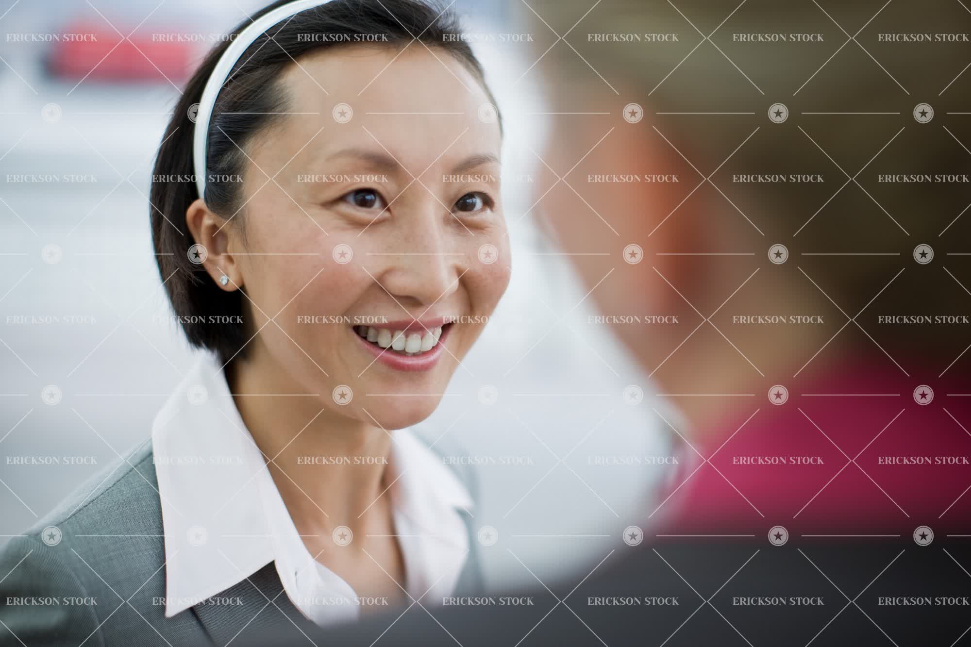 Smiling mid adult businesswoman listening to a female colleague.