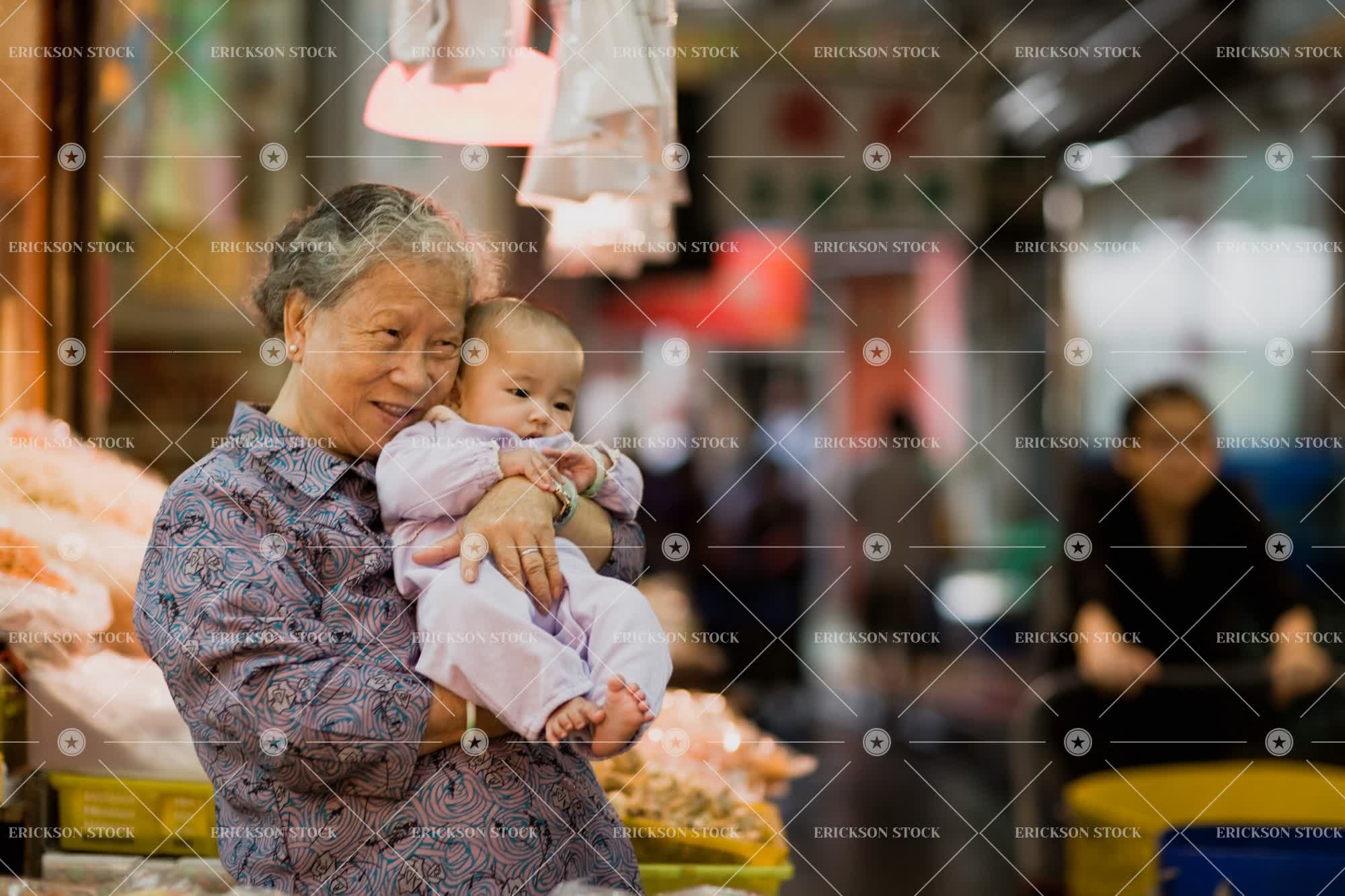 Tags affectionate, aisle, asian, baby, baby girl, care, carry, casual clothes, copy space, copy space right, display, elderly, family, female, focus on foreground, Food, Food and drink, grandchild, grandchildren, granddaughter, granddaughters, grandma, grandmas, grandmother, grandmothers, grandparent, grandparents, grannies, granny, half length, happiness, happy, hold, holding, horizontal, indoor, indoors, indoors market, indoors markets, infant, infants, inside, market, markets, mature adult, nana, nanas, negative space, negative space right, night, nighttime, old, people, purple, selection, senior adult, shopping, small business, smile, smiles, smiling, stands, toddler, tradition, two people, waist up, woman