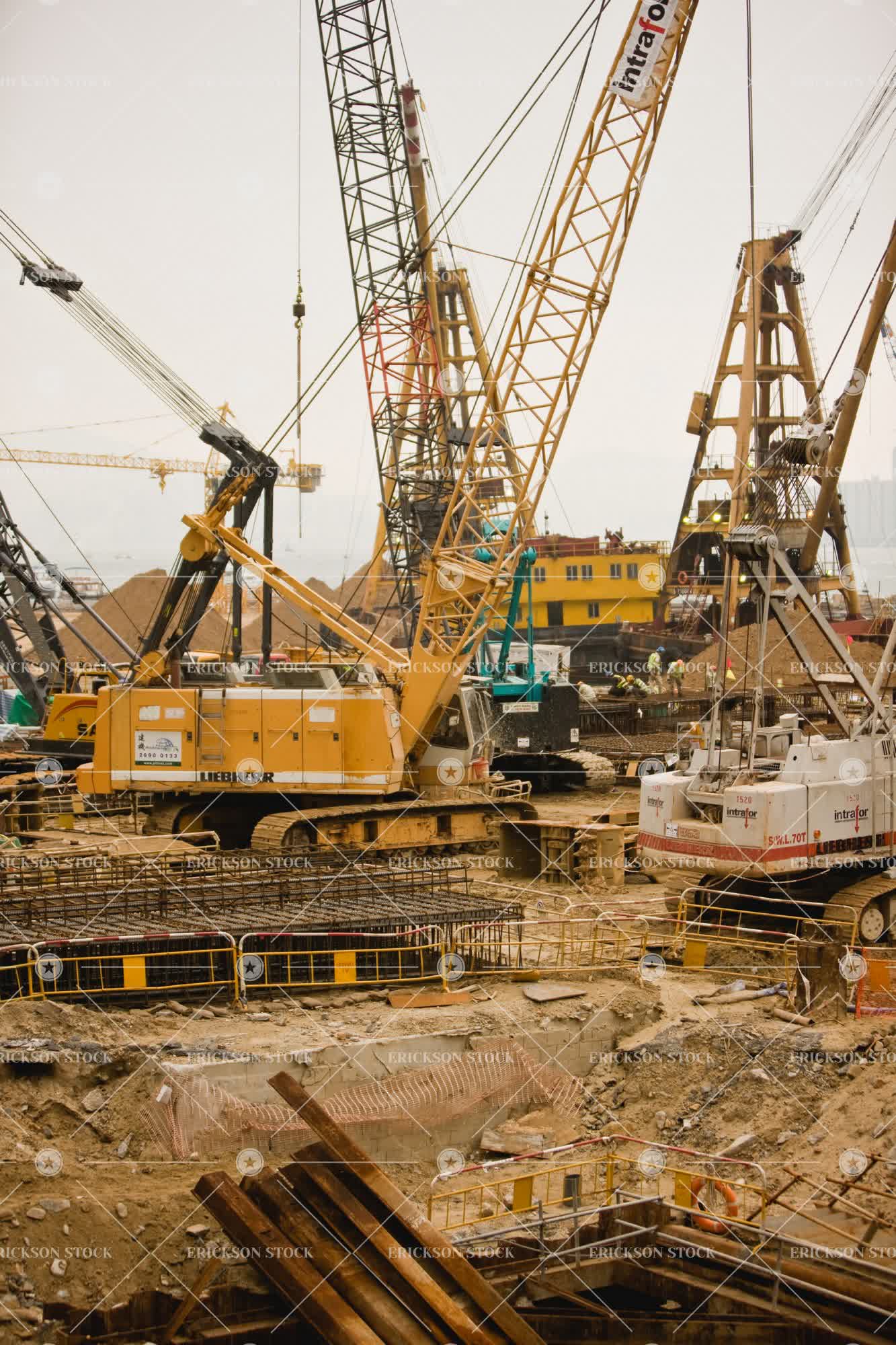 Large cranes and machinery in an urban construction site.