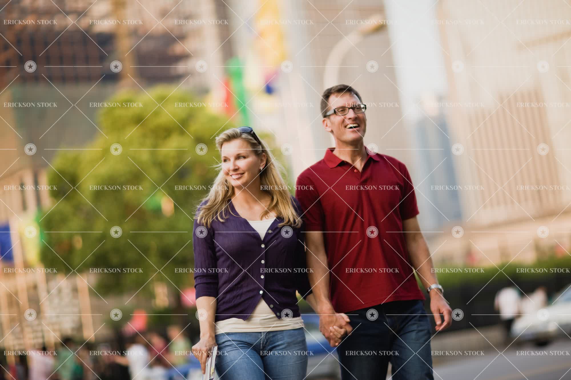 Happy mid-adult couple holding hands while walking together through a city.