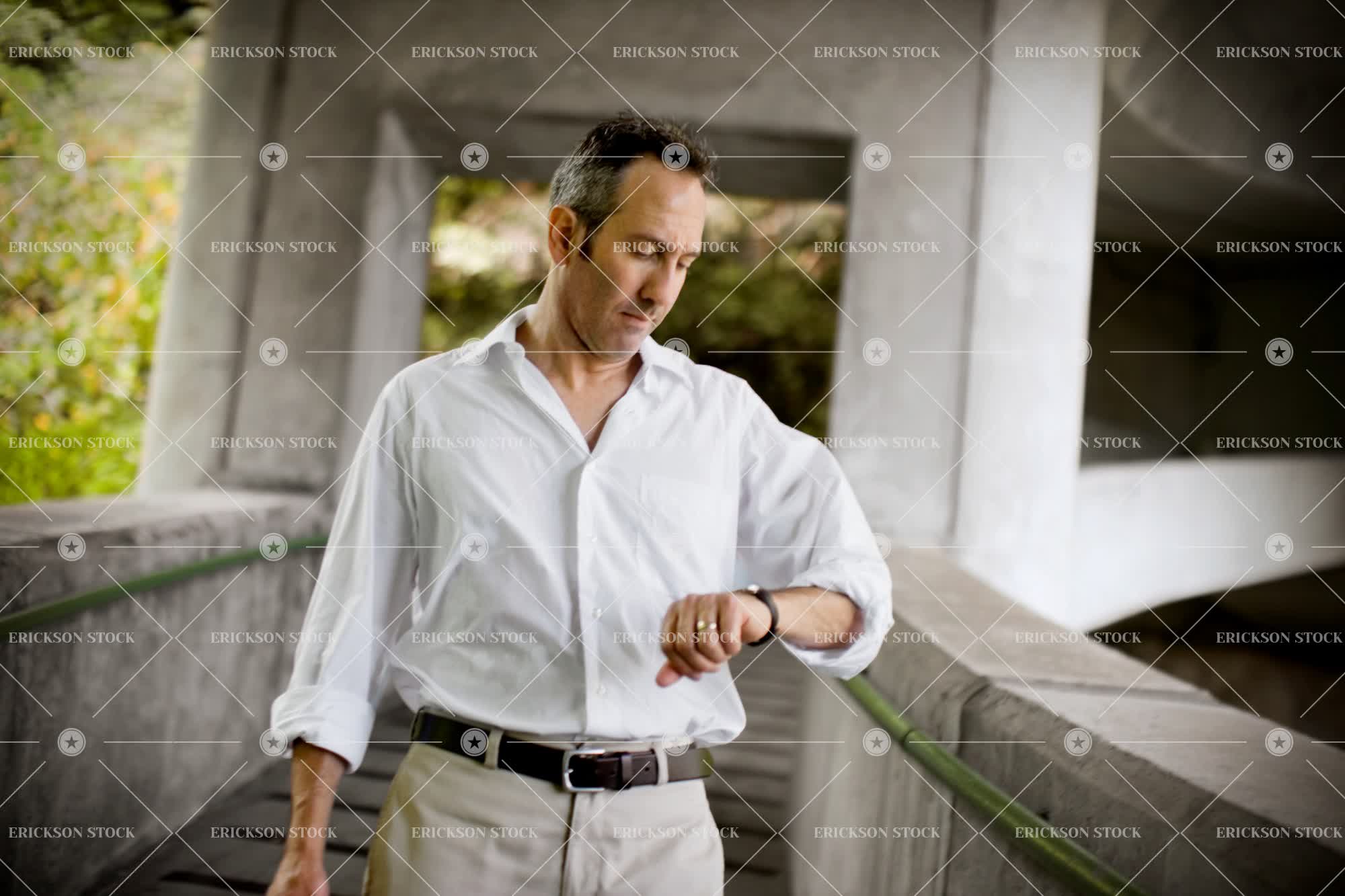 Mid-adult man in a white shirt looking at his watch while walking down a flight of stairs.