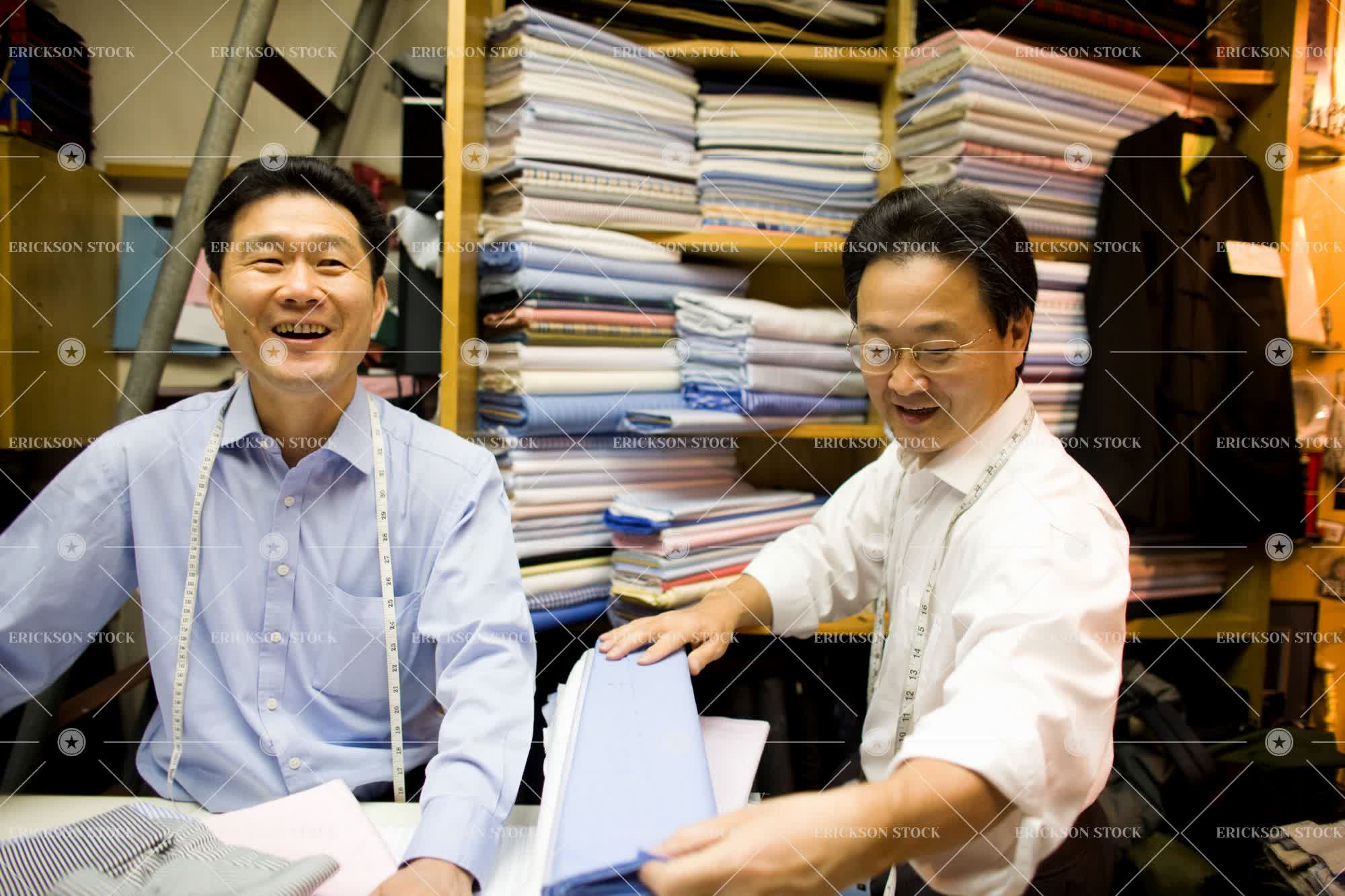 Tags adult, colleague, commerce, fabric, fabrics, folding, half length, happiness, happy, horizontal, indoor, indoors, inside, laughing, male, man, material, materials, mature adult, measuring tape, measuring tapes, Menswear, mid adult, people, retail, selective focus, shelf, shelves, shirt, shirts, shop, shops, smiling, store, stores, tape measure, tape measures, textile, textiles, two people, waist up