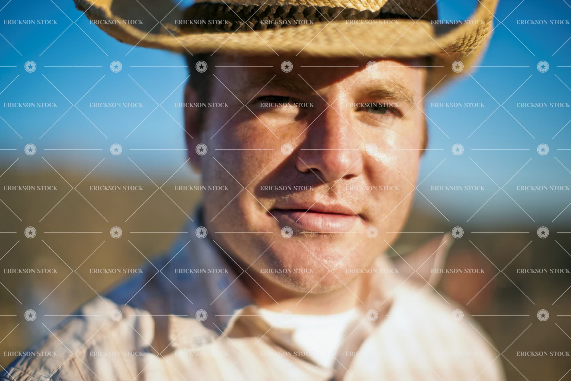 Tags adult, agriculture, casual clothes, caucasian, cheerful, content, cowboy, cowboy hat, day, delight, Eye contact, farm, farming, farms, field, fields, happiness, happy, hat, hats, head, head & shoulders, head and shoulders, head shot, headshot, horizontal, joy, joyful, look at camera, looking at camera, male, man, mature adult, mid adult, one person, outdoor, outdoors, outside, people, person, pleased, portrait, Portraits, ranch, rancher, ranchers, ranches, rural, selective focus, shoulders