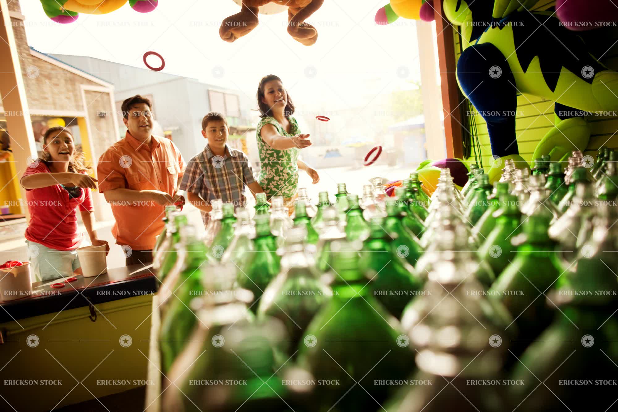 Smiling family playing a bottle toss game at an amusement park.