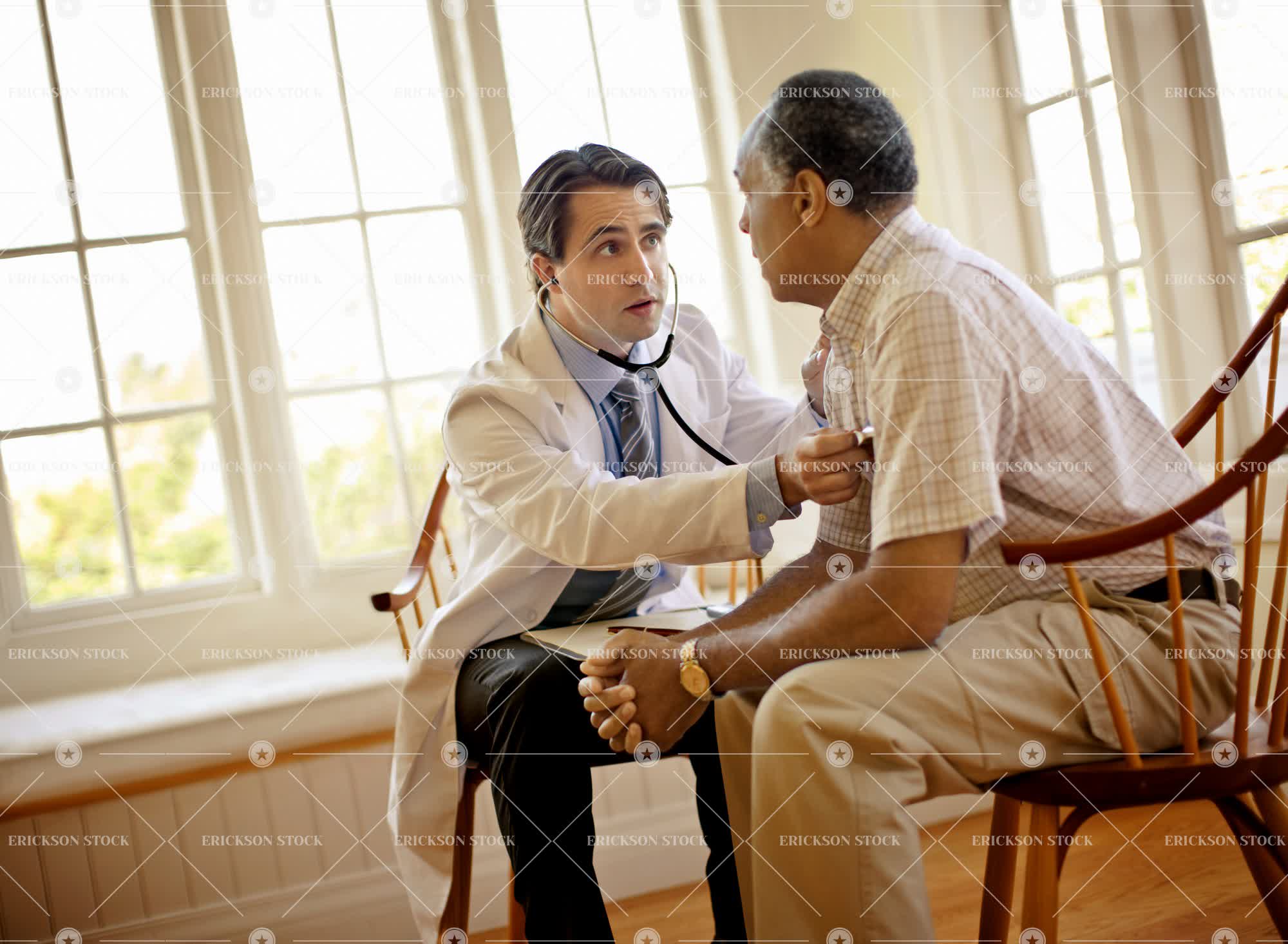 Tags adult, african american, caucasian, clinic, day, doctor, doctor's office, exam, examination, exams, expert, expertise, experts, health, healthcare, horizontal, hospital, hospitals, ill, illness, indoor, indoors, inside, lab coat, lab coats, male, man, mature adult, md, medical, medical condition, medical exam, medical practitioner, medical practitioners, medicine, mid adult, patient, patients, people, person, physician, physicians, problem, problems, selective focus, sick, sickness, specialist, specialists, stethoscope, stethoscopes, three quarter length, two people