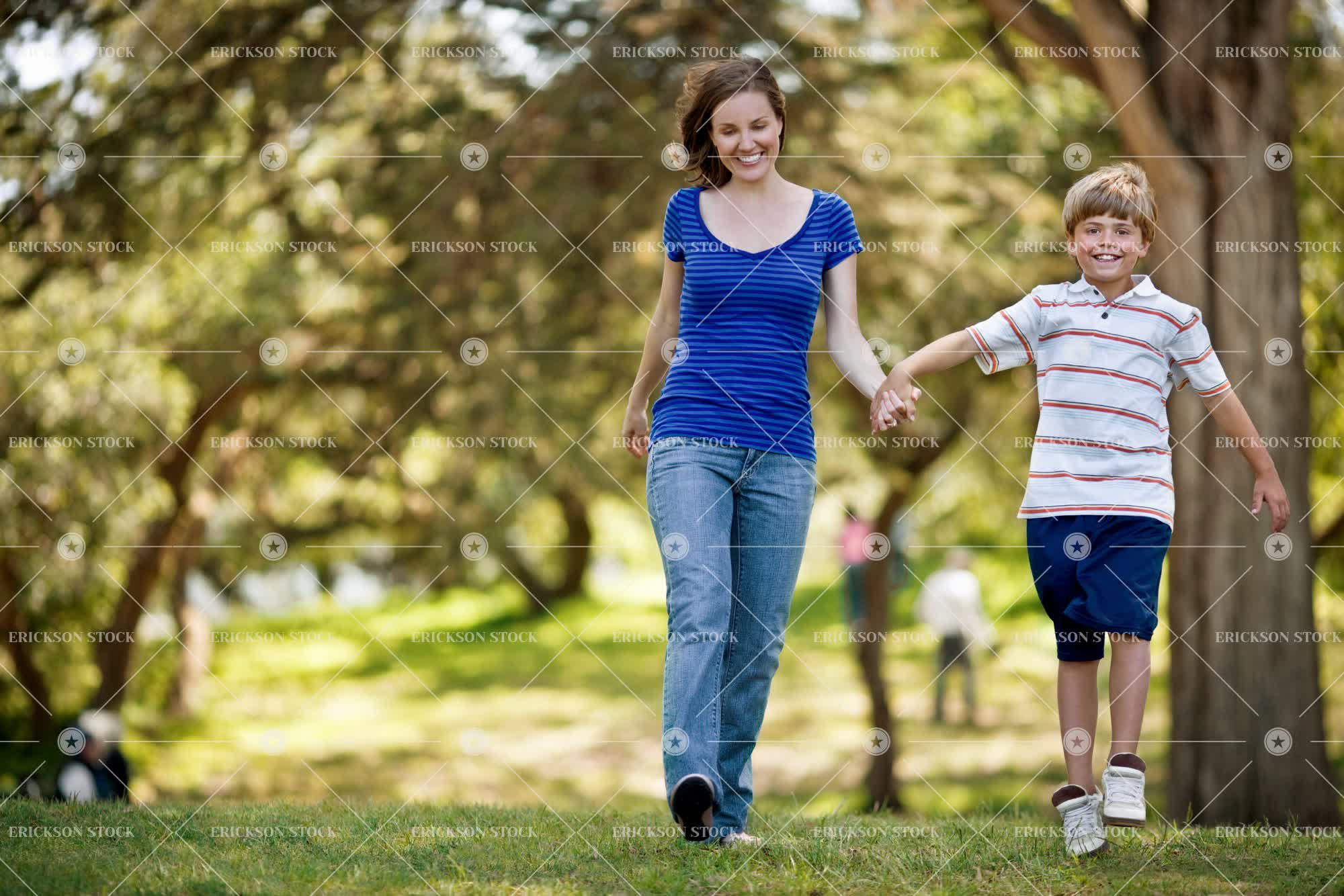 Boy holding his mother’s hand as they walk through the park.