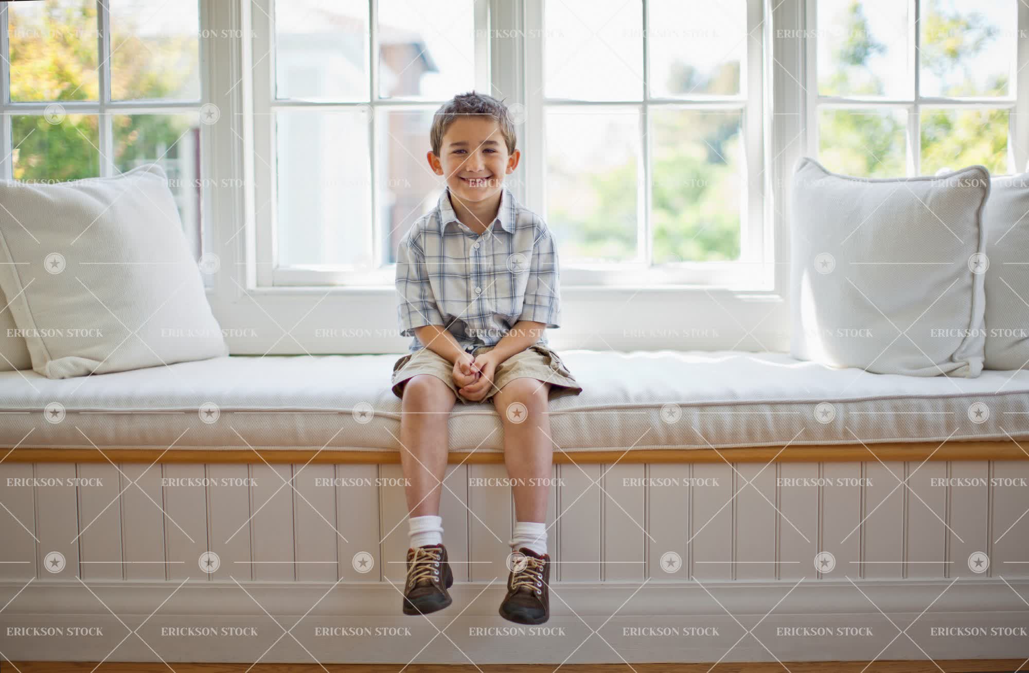 Tags boy, button down shirt, cargo shorts, caucasian, check, checkered, cheerful, child, collared shirt, combat shorts, cushion, delight, elementary age, enjoyment, Eye contact, full length, hands together, happiness, happy, home, home interior, home interiors, homes, horizontal, house, house interior, house interiors, houses, indoor, indoors, inside, interior, interiors, joy, joyful, kid, kids, lace up shoes, Living room, living rooms, look at camera, looking at camera, lounge, lounges, male, one person, people, person, plaid, seat, seating, seats, selective focus, shirt, shirts, Shorts, sit, sits, sitting, sitting room, sitting rooms, smile, smiling, window, window seat, window seats, windows