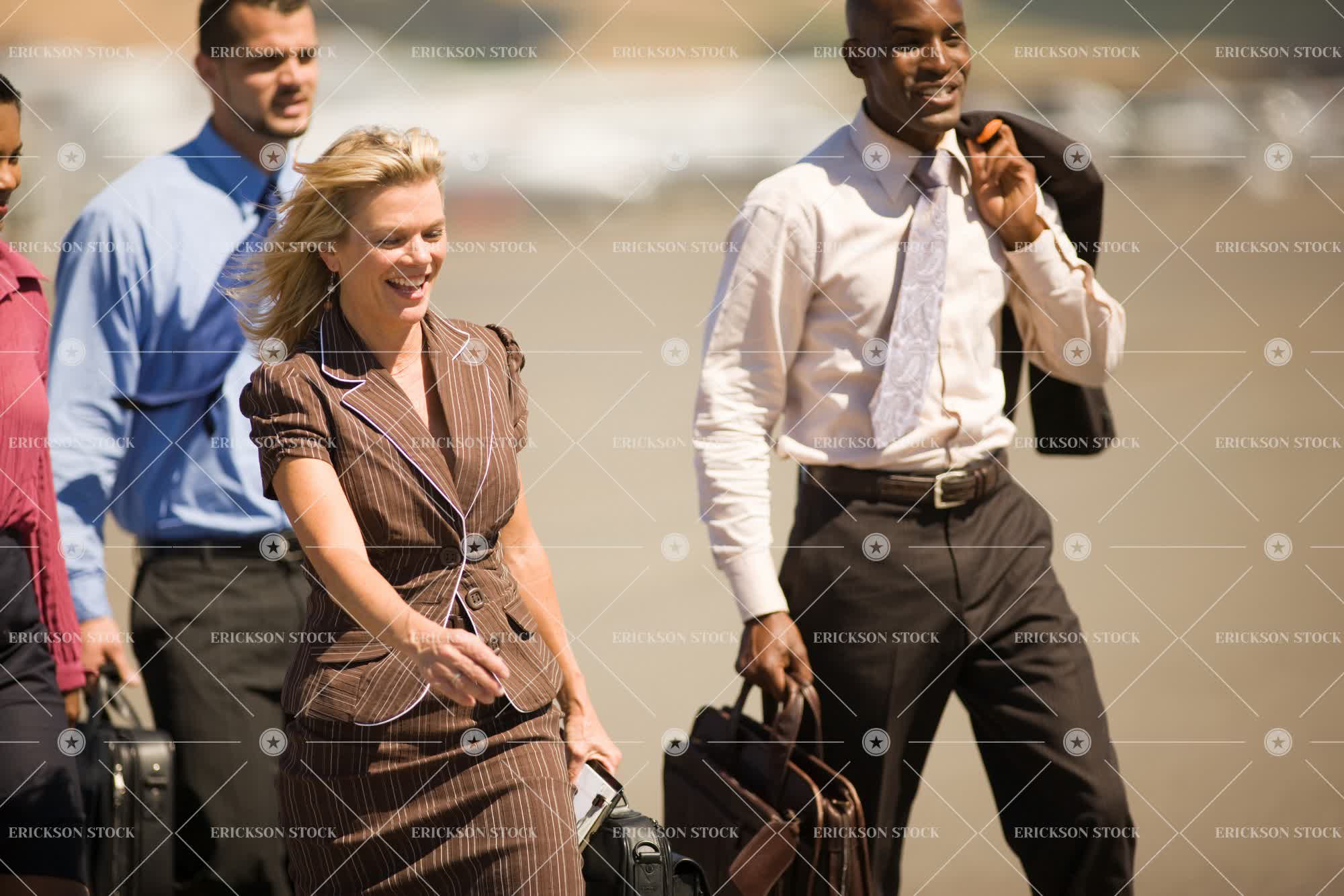 Tags adult, airport, briefcase, business, business man, business travel, business woman, day, female, formal, formal wear, formalwear, group, happiness, hold, holding, horizontal, male, man, mature adult, mid adult, outdoor, outdoors, outside, people, selective focus, small group of people, smiling, three quarter length, Walking, well-dressed, woman, young adult