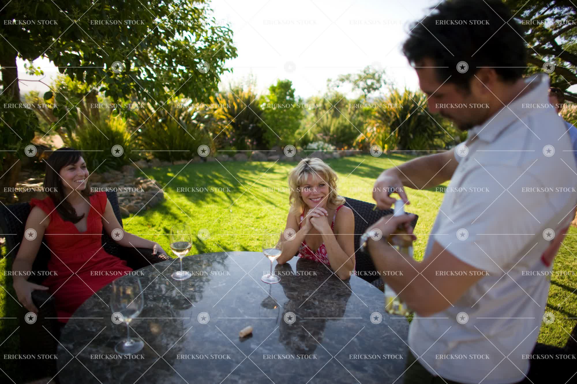 Two mid-adult woman sitting round a table outside waiting for a man to open a wine bottle.