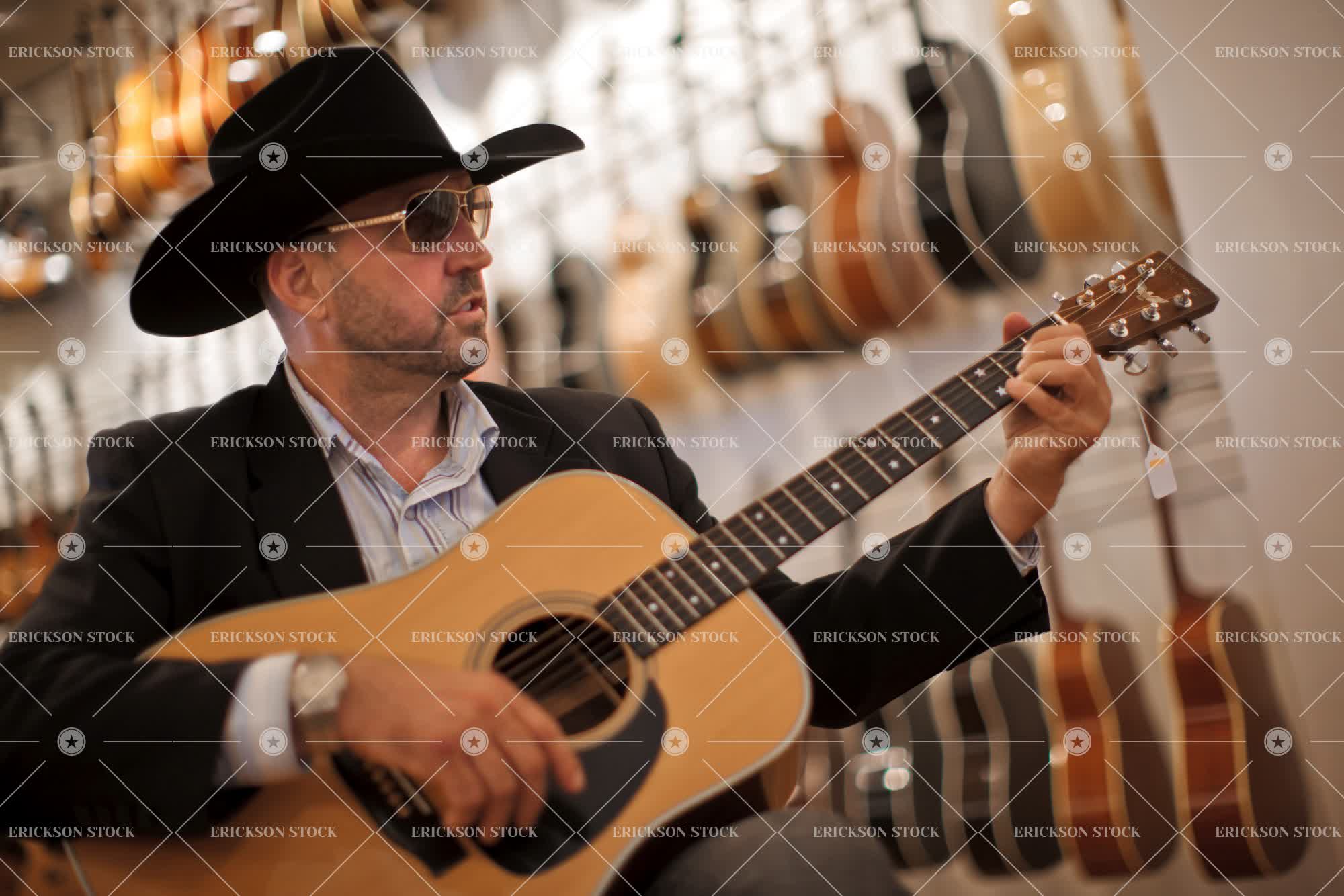 Tags acoustic guitar, adult, beard, caucasian, cowboy hat, facial hair, Guitar, guitar shop, guitar shops, guitar store, guitar stores, Guitarist, guitarists, guitars, hat, hats, horizontal, indoor, indoors, inside, instrument, instruments, male, man, mature adult, mid adult, Music, music shop, music shops, music store, music stores, Musical instrument, musical instruments, Musician, musicians, one person, people, person, play, play guitar, Playing, playing guitar, playing instrument, playing instruments, playing musical instrument, playing musical instruments, selective focus, shades, shop, shops, store, stores, strum, strum guitar, strumming, strumming guitar, stubble, stubbles, sunglasses