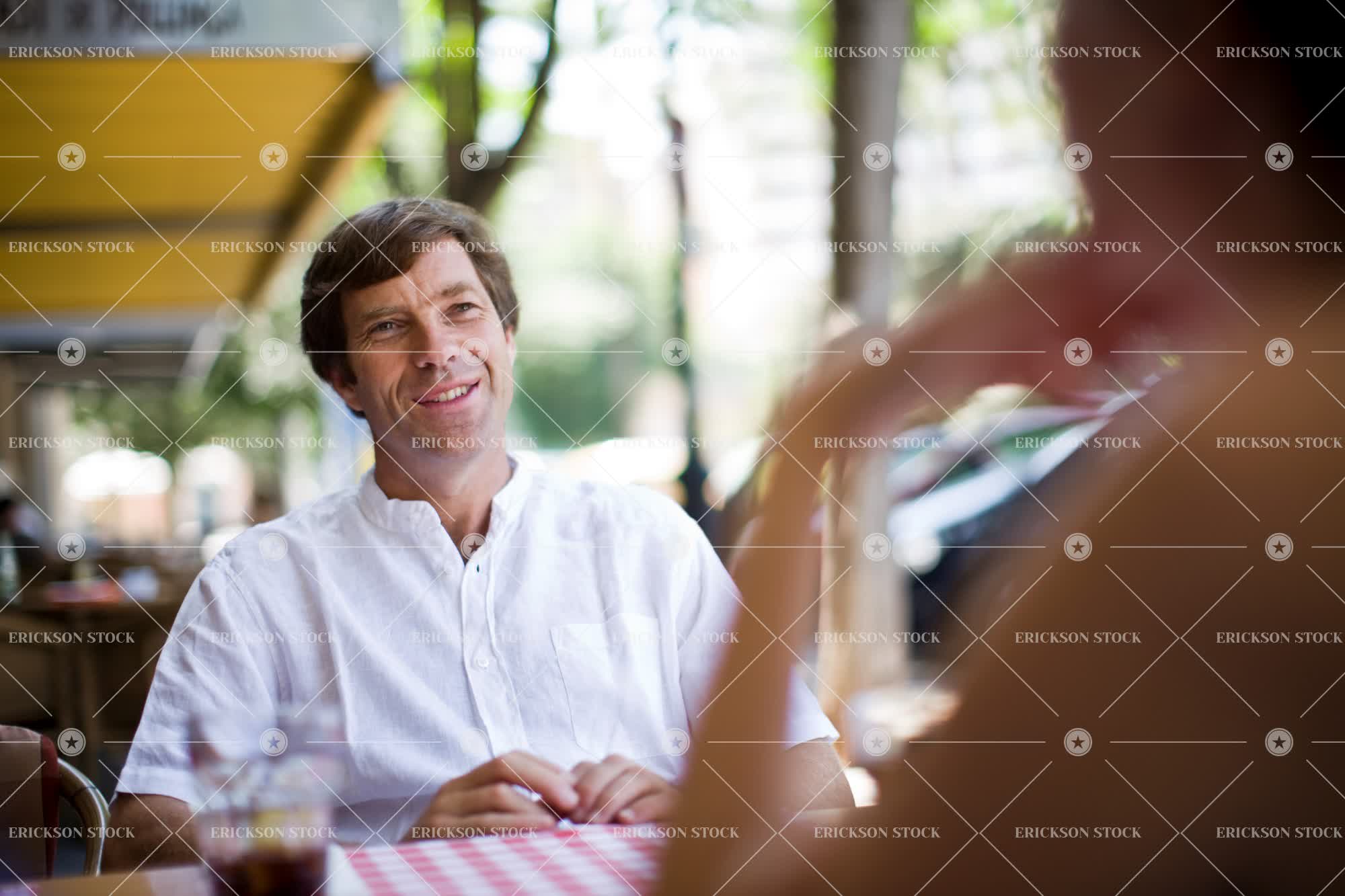 Tags adult, cafe, casual clothes, day, female, Growth, head, head & shoulders, head and shoulders, head shot, headshot, horizontal, man, mature adult, mid adult, natural, nature, outdoor, outdoors, outside, people, selective focus, shoulders, sit, sitting, Tree, trees, two people, woman, young adult