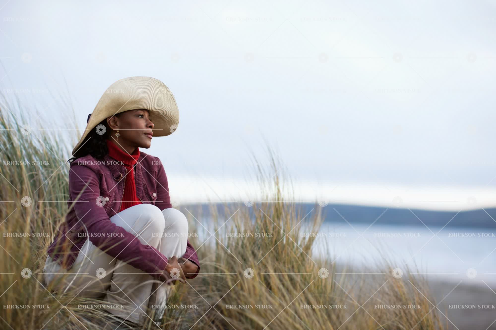 Tags adult, african american, beach, clear sky, coast, contemplate, copy space, copy space right, day, female, full length, grass, hat, hats, hold knees, holding knees, horizontal, hug knees, hugging knees, long grass, look at view, looking at view, mature adult, mid adult, negative space, negative space right, one person, outdoor, outdoors, outside, pensive, people, person, profile, seaside, seasides, serene, serenity, serious, seriously, shoreline, shorelines, Side view, sit, sitting, sunhat, sunhats, thinking, thoughtful, tranquil, tranquil scene, tranquility, water, wide-brimmed hats, woman