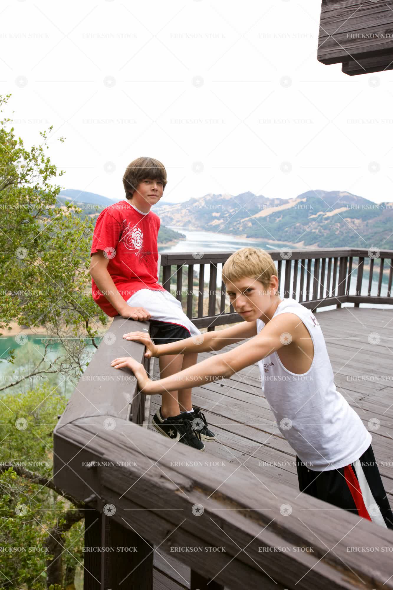 Tags architectural exterior, balcony, boy, brother, building, casual clothes, caucasian, child, copy space, copy space top, day, deck, exterior, Eye contact, friend, friends, friendship, full length, kid, kids, lean, leaning, leans, look at camera, looking at camera, male, mountain, mountain range, mountain ranges, mountains, negative space, negative space top, outdoor, outdoors, outside, people, pre-adolescent, pre-adolescents, Pre-teen, pre-teens, preteen, preteens, railing, river, rivers, sibling, siblings, sit, sitting, subject bottom, teenage boy, teenager, three quarter length, together, togetherness, tween, two people, vertical, water