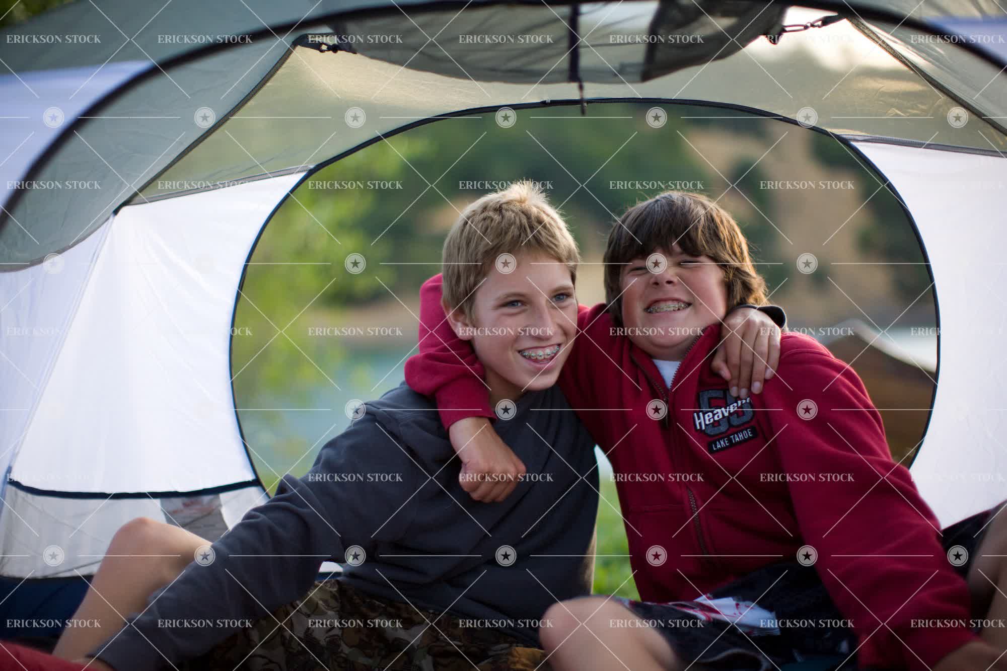 Tags arm around, boy, brother, camp, canvas, casual clothes, caucasian, cheerful, child, day, friend, friends, friendship, front view, grin, grinning, half length, happiness, happy, holiday, holidays, horizontal, kid, kids, Lake, lakes, laughing, leisure, leisure activities, leisure activity, leisurely, male, natural, nature, outdoor, outdoors, outside, people, pond, ponds, pre-adolescent, pre-adolescents, Pre-teen, pre-teens, preteen, preteens, pulling a face, pulling faces, recreation, recreational, recreational pursuit, recreational pursuits, shelter, sheltered, sibling, siblings, sit, sitting, smile, smiles, smiling, teenage boy, teenager, tent, tents, together, togetherness, tween, two people, Vacation, vacations, waist up, water