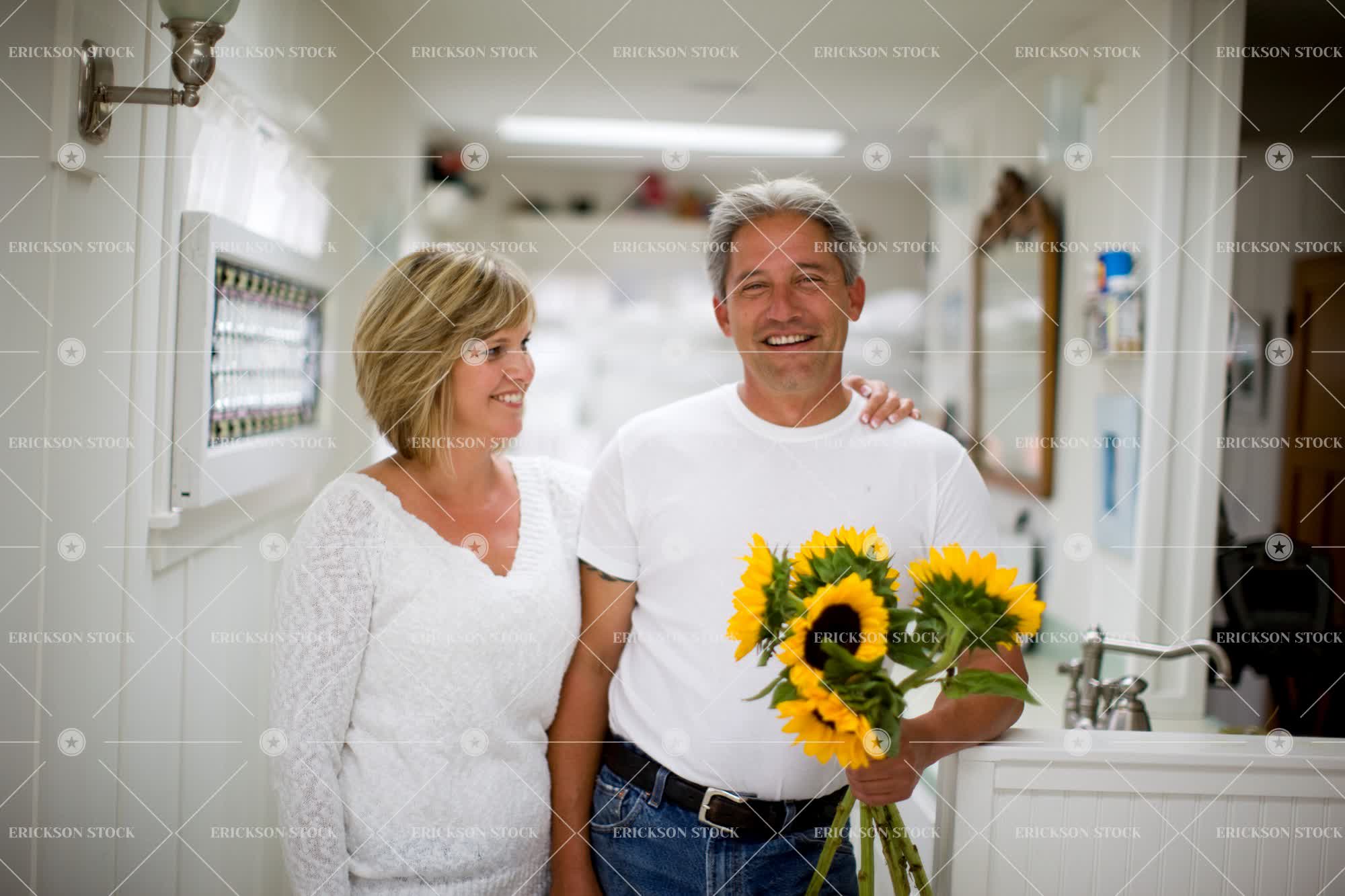 Tags adult, casual clothes, caucasian, corridor, couple, day, Eye contact, female, flower, flowers, front view, gift, gifts, grin, grinning, half length, hall, halls, hallway, hallways, heterosexual couple, heterosexual couples, hold, holding, home, homes, horizontal, house, houses, Husband, husband and wife, husbands, indoor, indoors, inside, look at camera, looking at camera, male, man, marriage, married, mature adult, mid adult, people, plant, plants, present, presents, relationship, relationships, residence, residences, smile, smiles, smiling, spouse, spouses, stand, standing, sunflower, sunflowers, three quarter length, together, togetherness, two people, waist up, wife, wives, woman