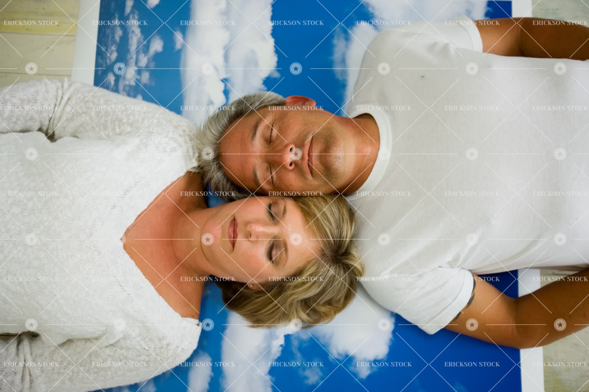 Mid-adult couple lying next to each other against a cloudy sky backdrop with their eyes closed.