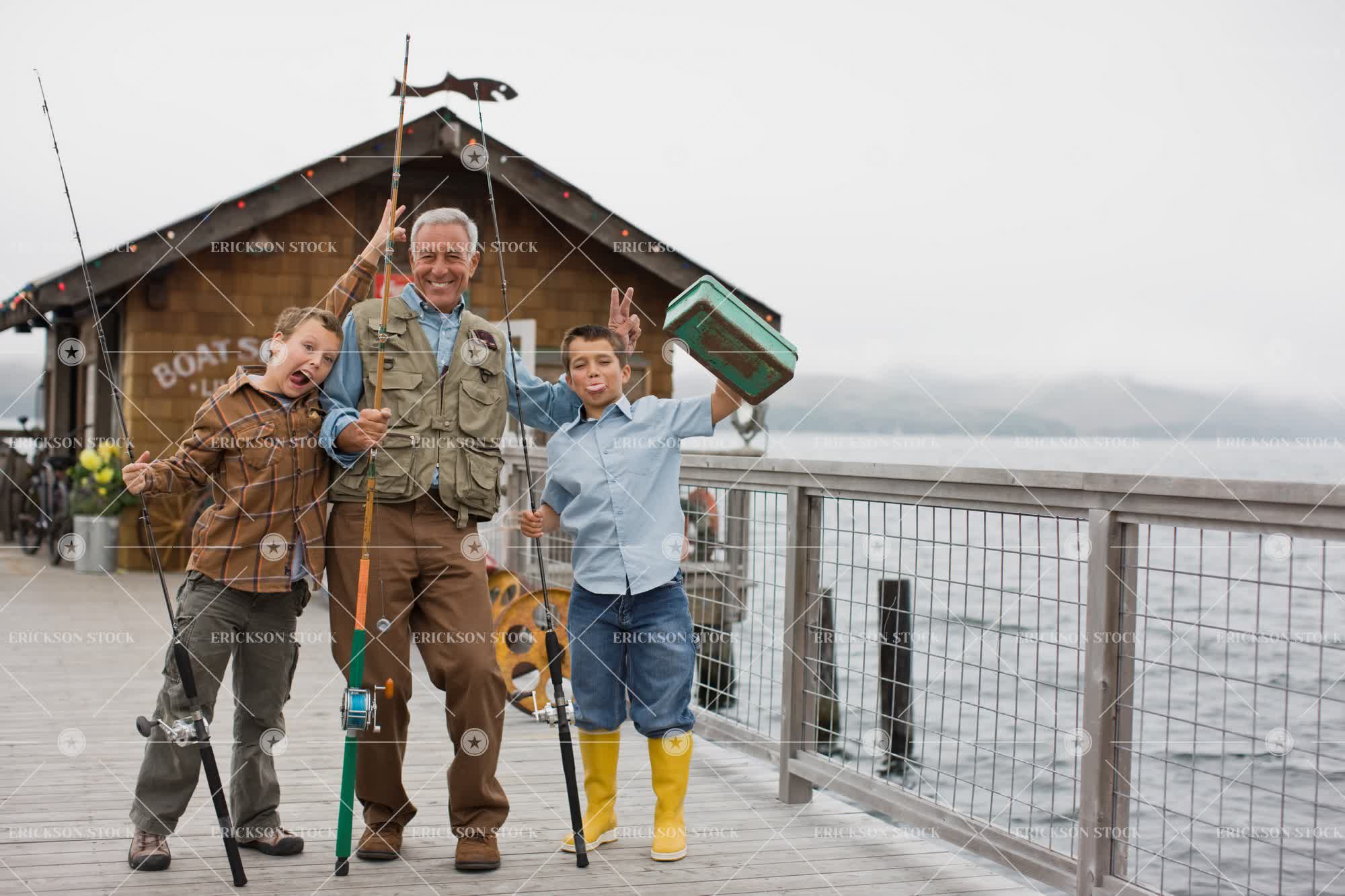 Portrait of a happy father making silly faces with his two sons on a wharf while holding fishing gear.