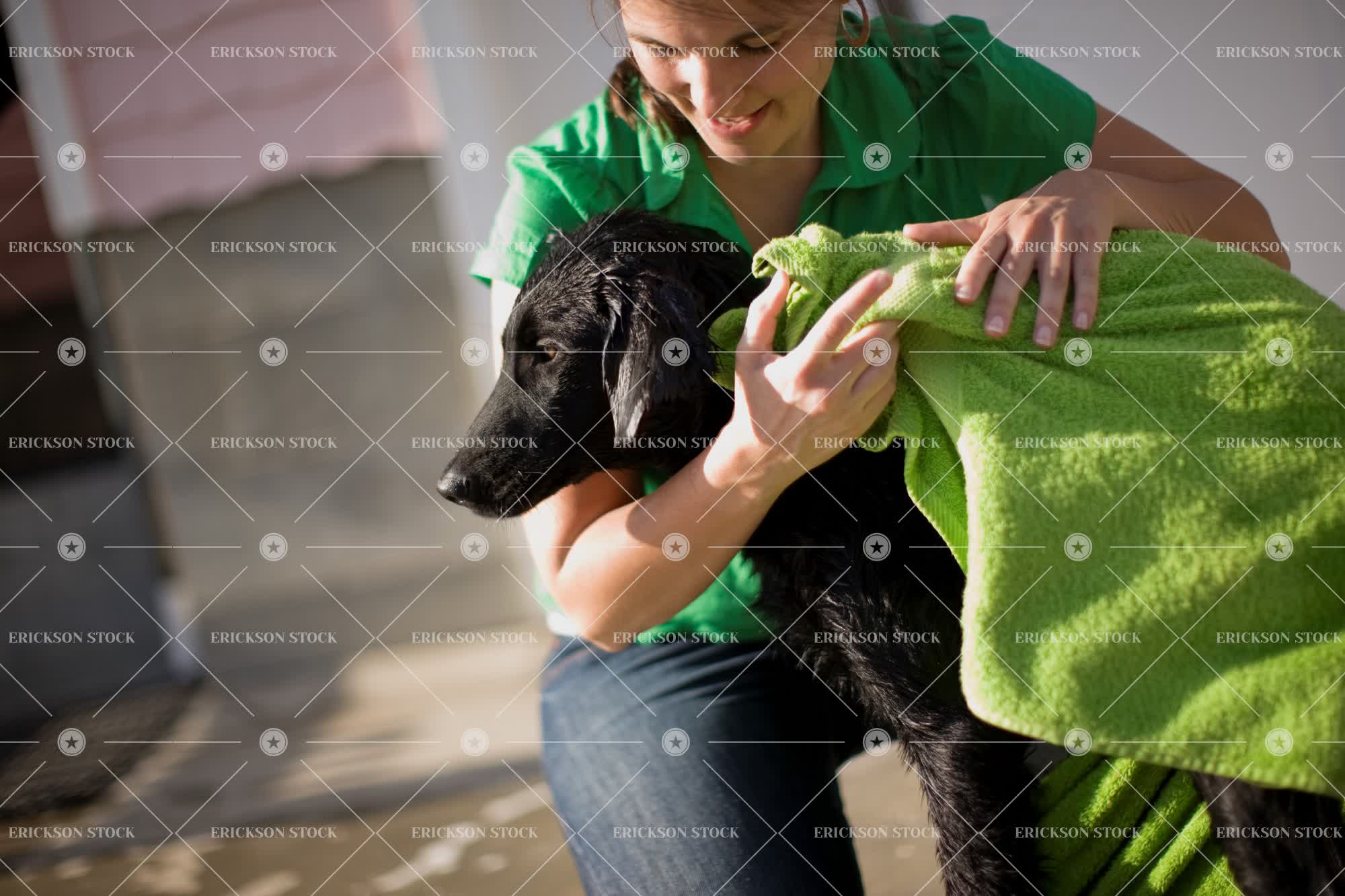 Wet black dog being dried off with a green towel by its female owner.