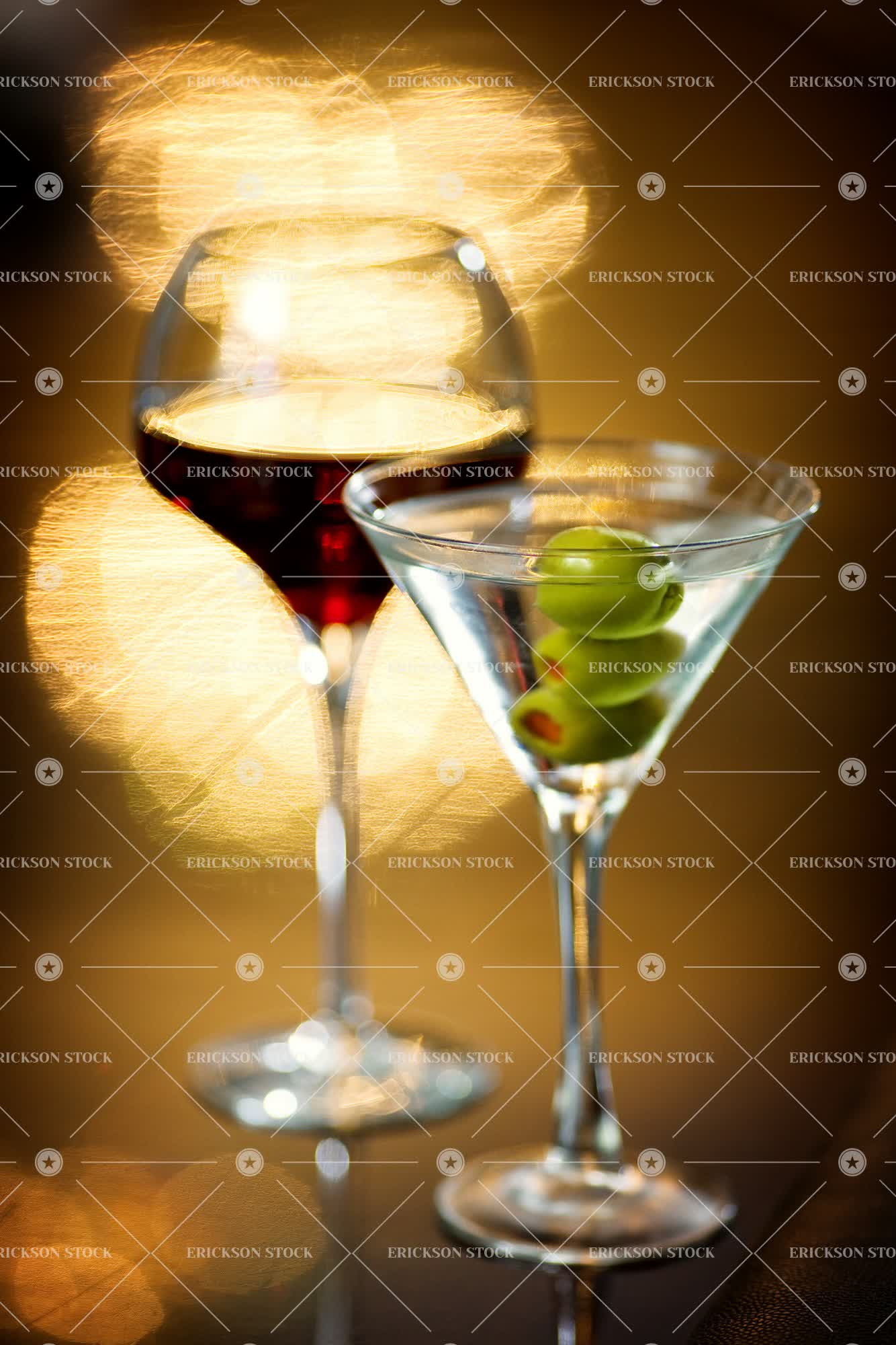 Tags alcohol, bar, cocktail, counter, drink, Food and drink, fruit, fruits, glass, glasses, indoor, indoors, inside, leisure, leisure activities, leisure activity, martini glass, martini glasses, next to, nightlife, nobody, olive, olives, pair, pairs, pub, pubs, recreation, recreational pursuit, recreational pursuits, red wine, selective focus, side by side, vertical, wine, wine glass, wine glasses, wineglass, wineglasses