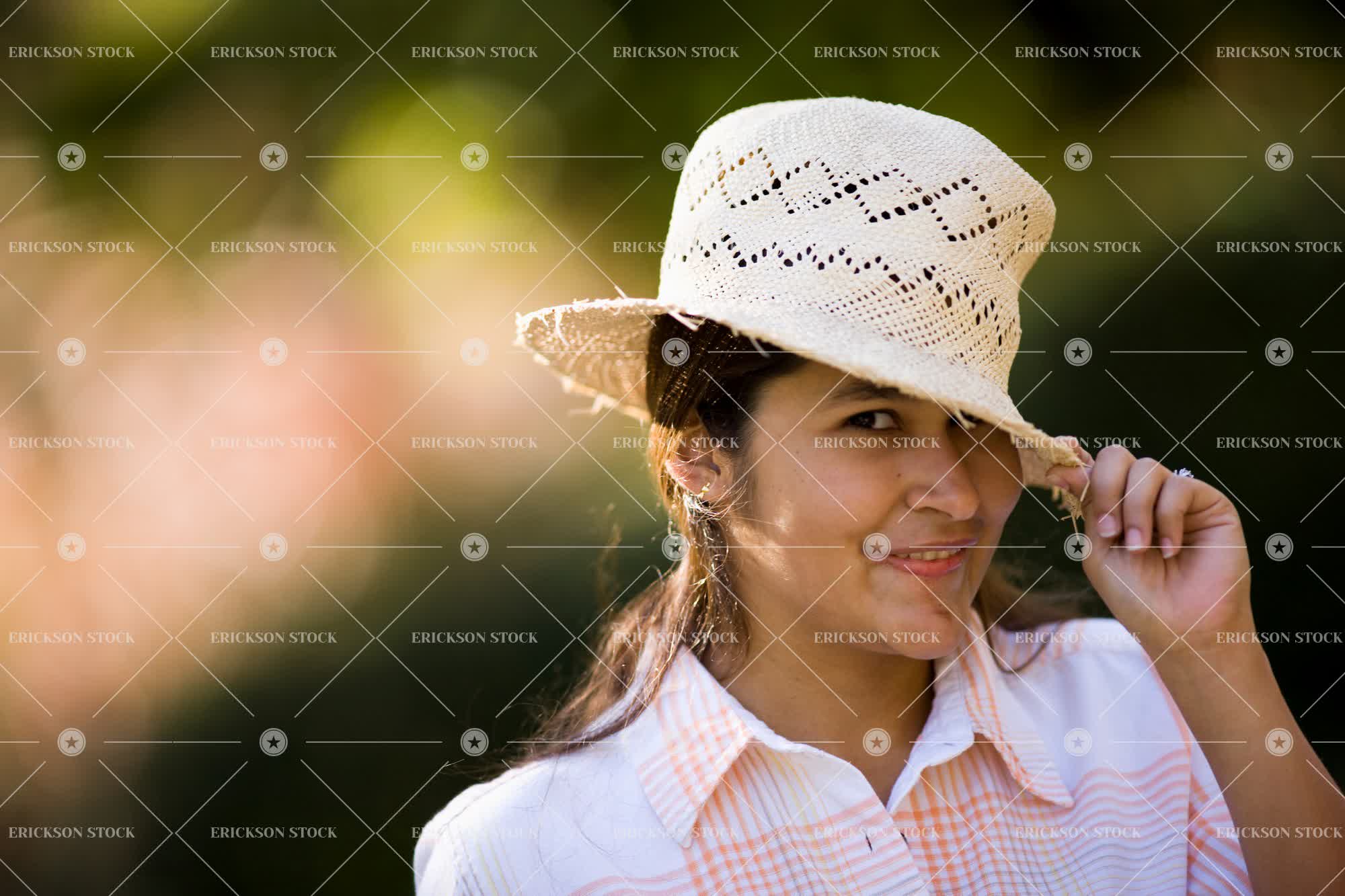 Tags backyard, day, female, front or back yard, frontyard, frontyards, garden, gardens, girl, girls, grass, happiness, hat, hats, head, head & shoulders, head and shoulders, head shot, headshot, hold, holding, horizontal, latin american, lawn, looking at camera, one person, outdoor, outdoors, outside, people, person, portrait, Portraits, selective focus, shoulders, smiling, Straw hat, straw hats, teenage girl, teenager, woman, young adult