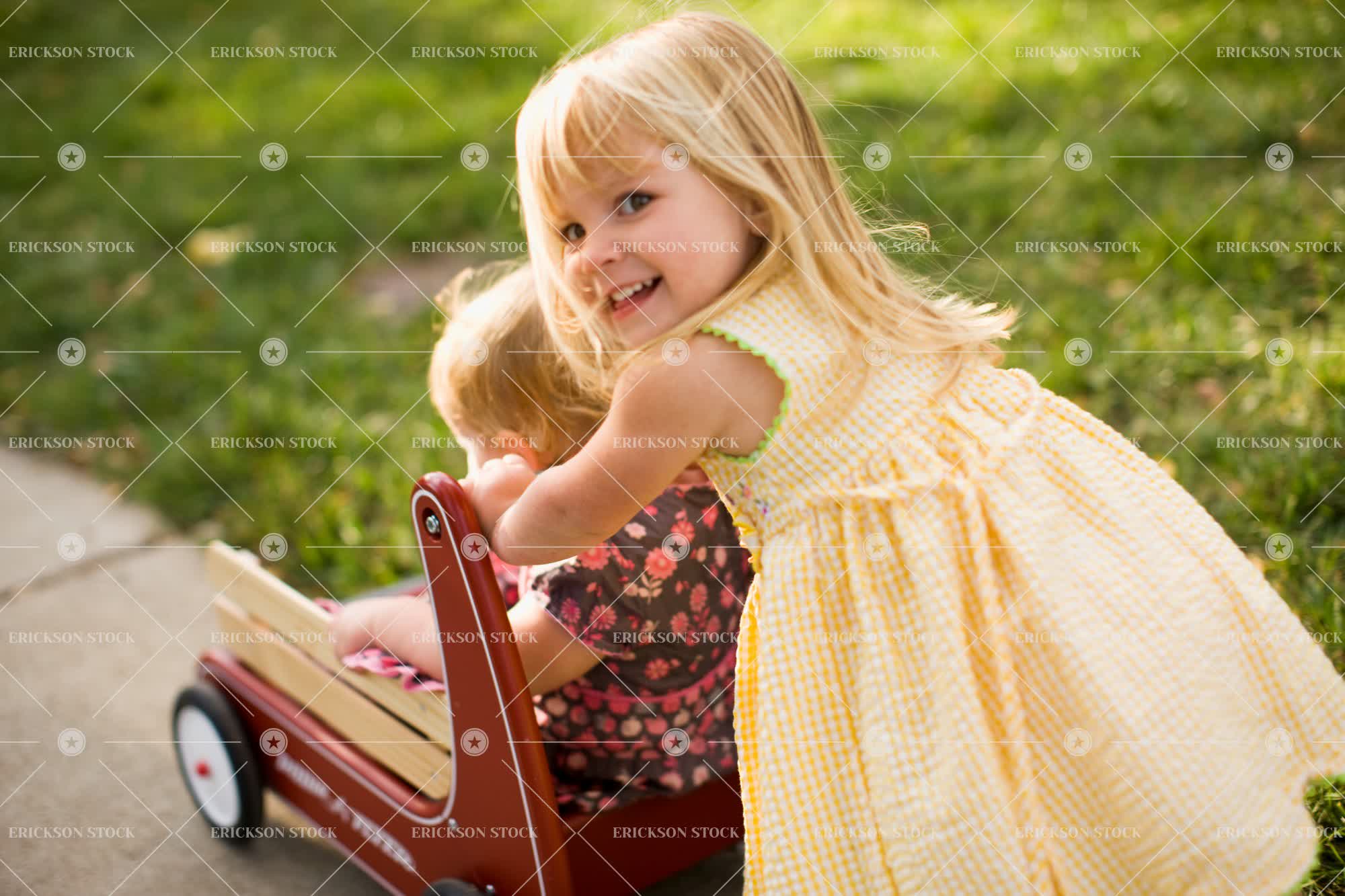 Tags adorable, baby, baby girl, blond, child, Cute, day, elementary age, female, footpath, footpaths, girl, girls, happiness, horizontal, infant, infants, kid, kids, look over shoulder, looking at camera, looking over shoulder, outdoor, outdoors, outside, pavement, people, play, Playful, Playing, preschooler, preschoolers, pushing, selective focus, sibling, siblings, sidewalk, sidewalks, sister, sisters, smiling, three quarter length, toddler, towhead, two people, wagon, wagons