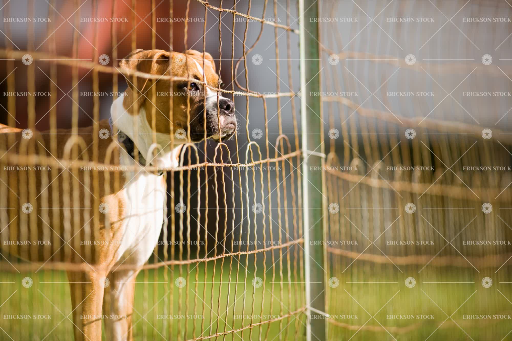 Tags animal, anticipation, backyard, boxer dog, curious, day, dog, domestic, Fence, fenced, fences, front or back yard, frontyard, frontyards, garden, gardens, grass, horizontal, inquiring, inquisitive, lawn, nobody, one animal, outdoor, outdoors, outside, pet, pets, selective focus, Side view, trapped, waiting