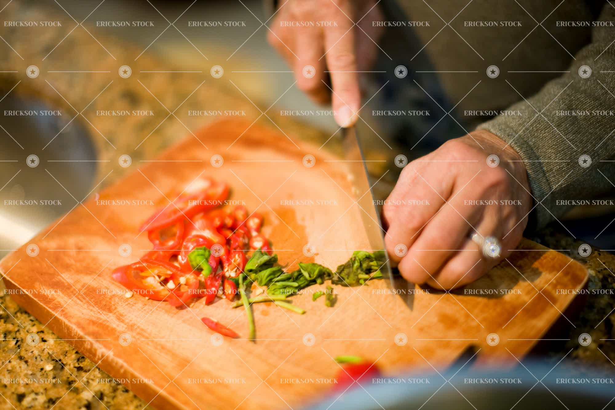 Tags adult, basil, chili pepper, chopping board, close up, cook, cut, cutting board, diamond, diamond ring, female, Food, Food and drink, food preparation, garnish, garnishes, hand, Hands, herb, herbs, high angle, high angle view, home, horizontal, human hand, human hands, indoor, indoors, inside, Kitchen, kitchen knife, kitchen knives, Kitchens, knife, knives, mature adult, mid adult, one person, people, person, preparation, prepare, preparing, preparing food, ring, rings, seasoning, seasonings, selective focus, senior adult, slice, sliced, slicing, wedding ring, wedding rings, woman