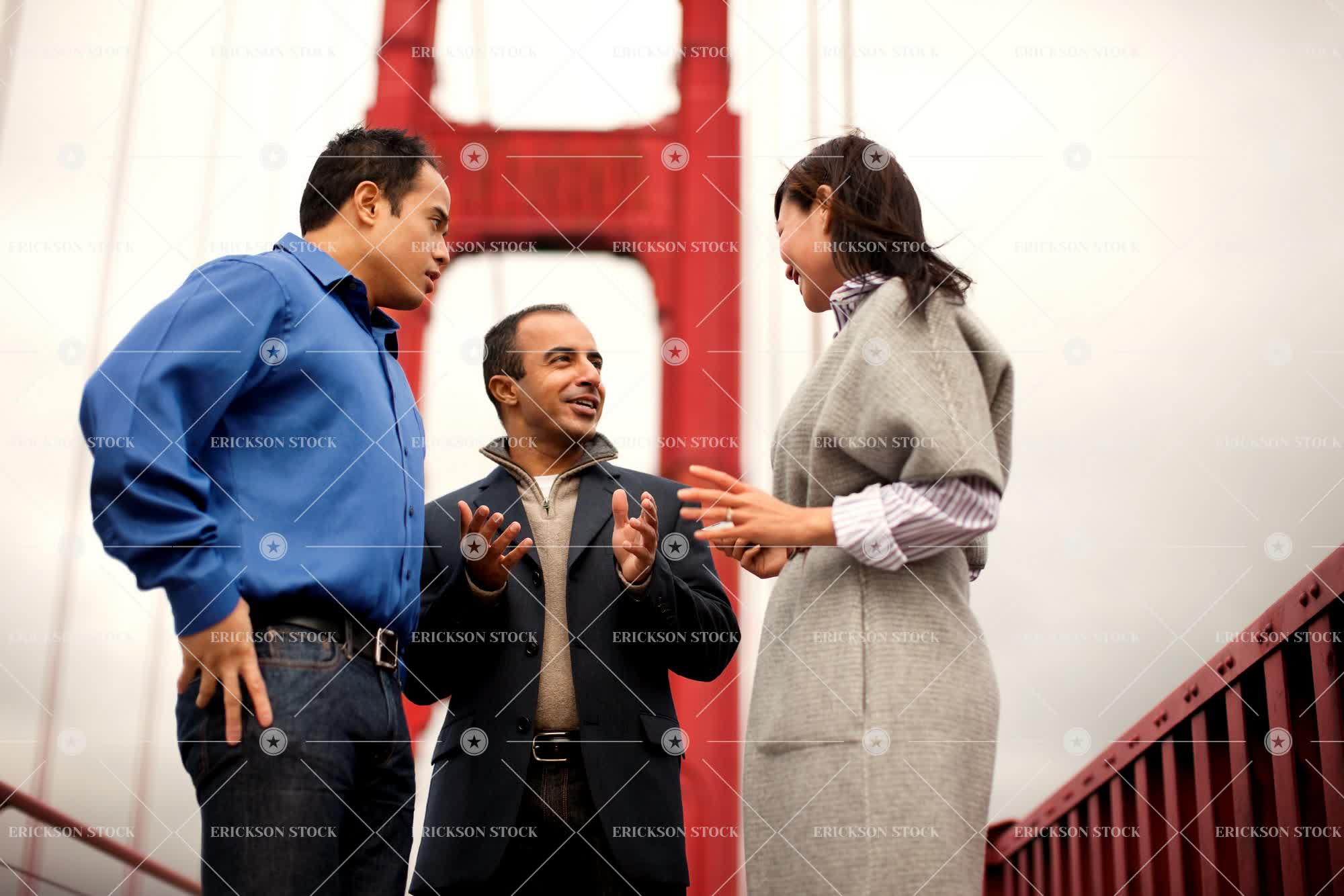 Three colleagues speak together on the Golden Gate Bridge, San Francisco, USA.