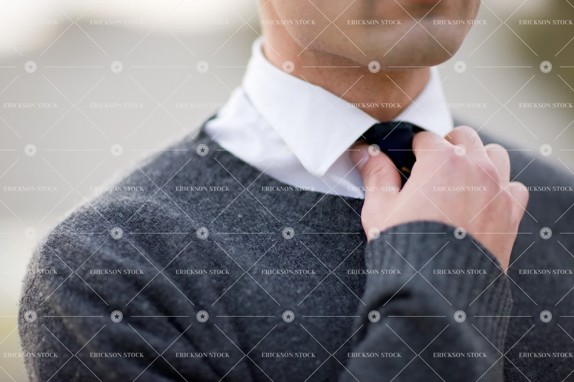 Tags 1950s style, adult, cropped, day, jersey, jerseys, jumper, jumpers, mature adult, midsection, one person, outdoor, outdoors, outside, part of, people, period clothing, period costume, person, pullover, pullovers, retro revival, selective focus, sweater, sweaters, tie, ties, top, tops, tying tie, tying ties, young adult