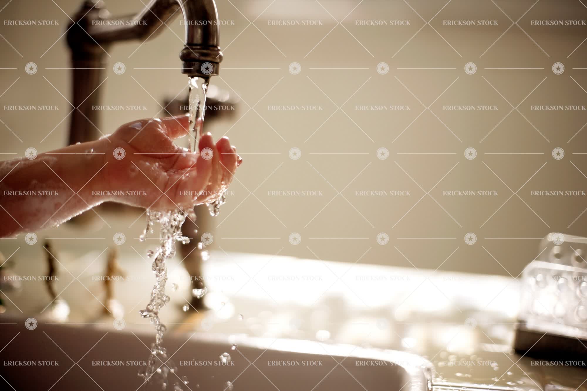 Tags bathroom, child, clean, copy space, copy space right, Faucet, faucets, flowing water, hand, Hands, home interior, home interiors, horizontal, human hand, human hands, Hygiene, hygienic, indoor, indoors, inside, negative space, negative space right, one person, part of, people, person, selective focus, Sink, sinks, soap, soap suds, tap, taps, Washing, washing hands, water