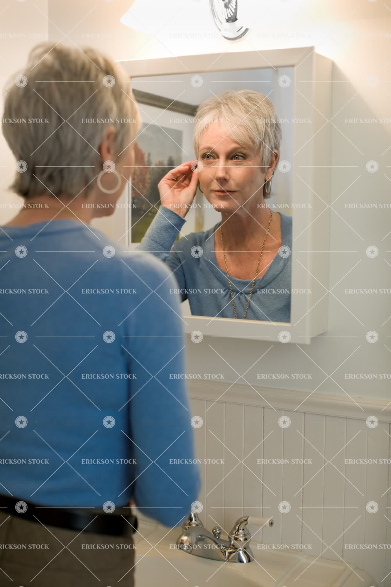 Tags adult, bathroom, casual clothes, caucasian, day, female, feminine, getting ready, grooming, hair, half length, home interior, home interiors, human hair, indoor, indoors, inside, mature adult, mid adult, mirror, mirrors, one person, people, person, preparation, prepare, preparing, selective focus, senior adult, vertical, waist up, woman