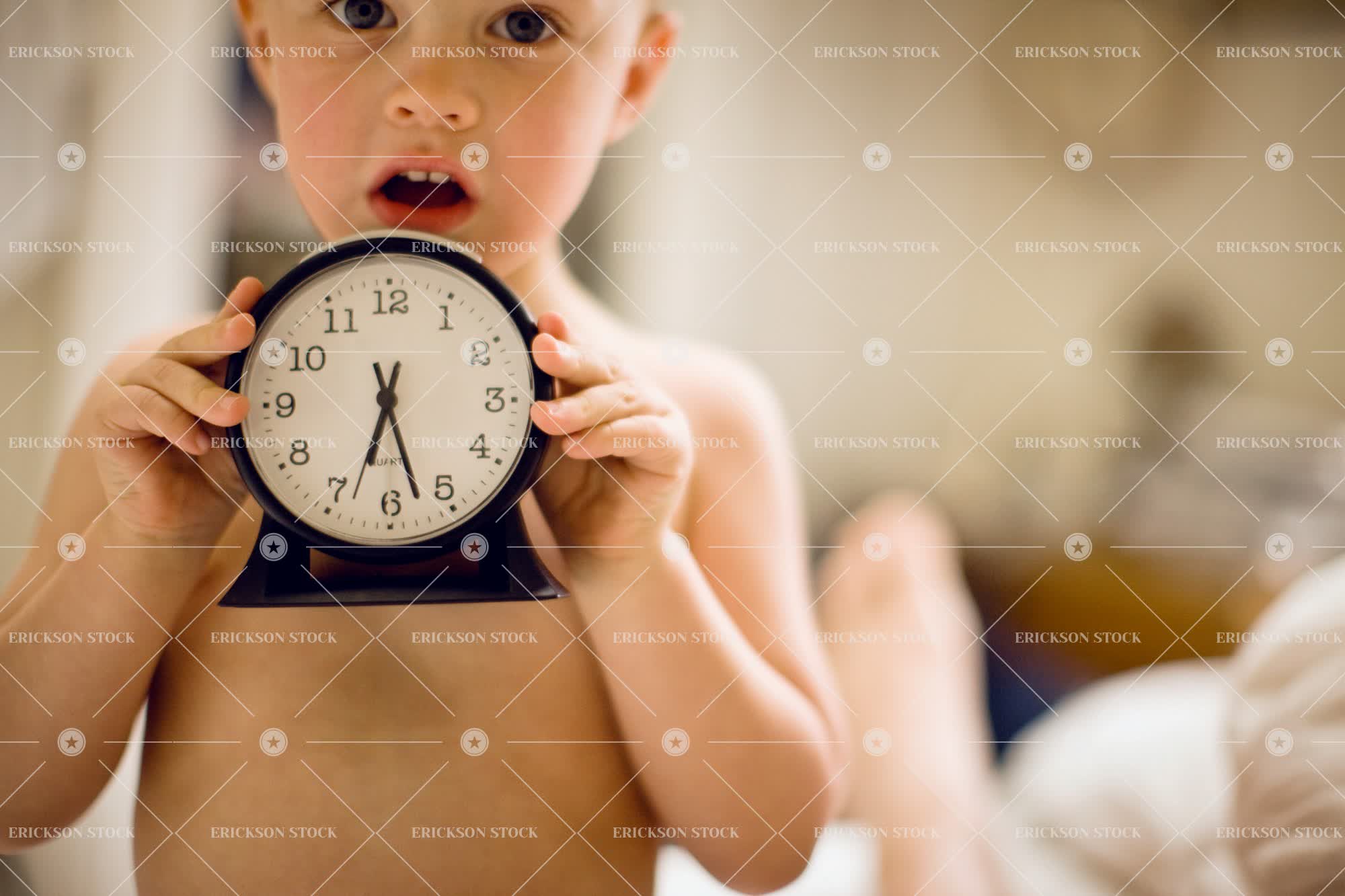 Tags background people, bare chested, boy, caucasian, child, clock, Eye contact, half length, hold, holding, horizontal, indoor, indoors, inside, kid, kids, look at camera, looking at camera, male, morning, mornings, people in the background, person, preschool age, preschooler, preschoolers, selective focus, semi dress, shirtless, time, toddler, waist up