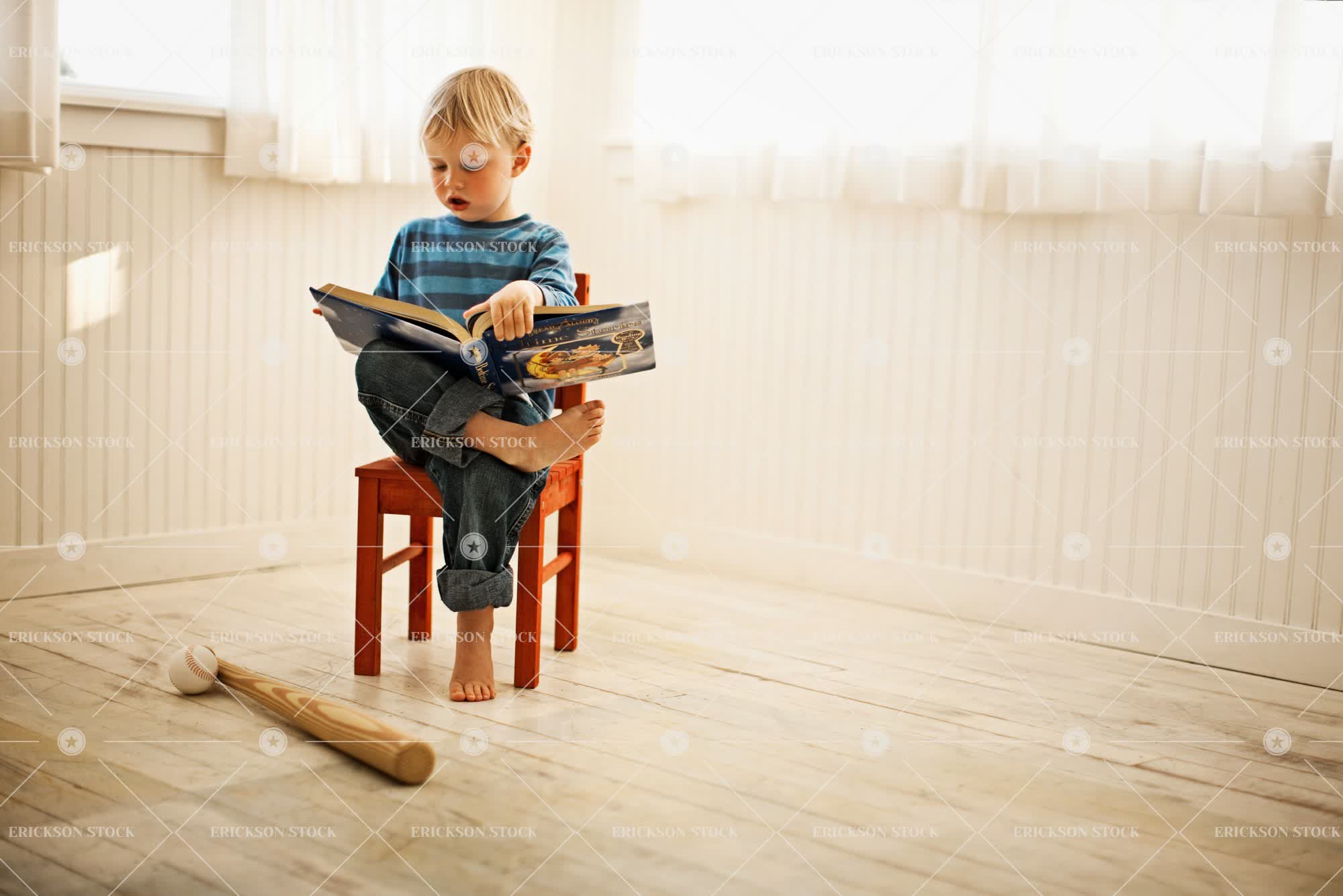 Tags baseball, baseball bat, blond, book, boy, caucasian, chair, child, copy space, day, full length, home interior, home interiors, horizontal, indoor, indoors, inside, kid, kids, leisure, leisure activities, leisure activity, male, negative space, negative space right, one person, person, preschool age, preschooler, preschoolers, read, reading, seat, seats, selective focus, sit, sitting, toddler, towhead