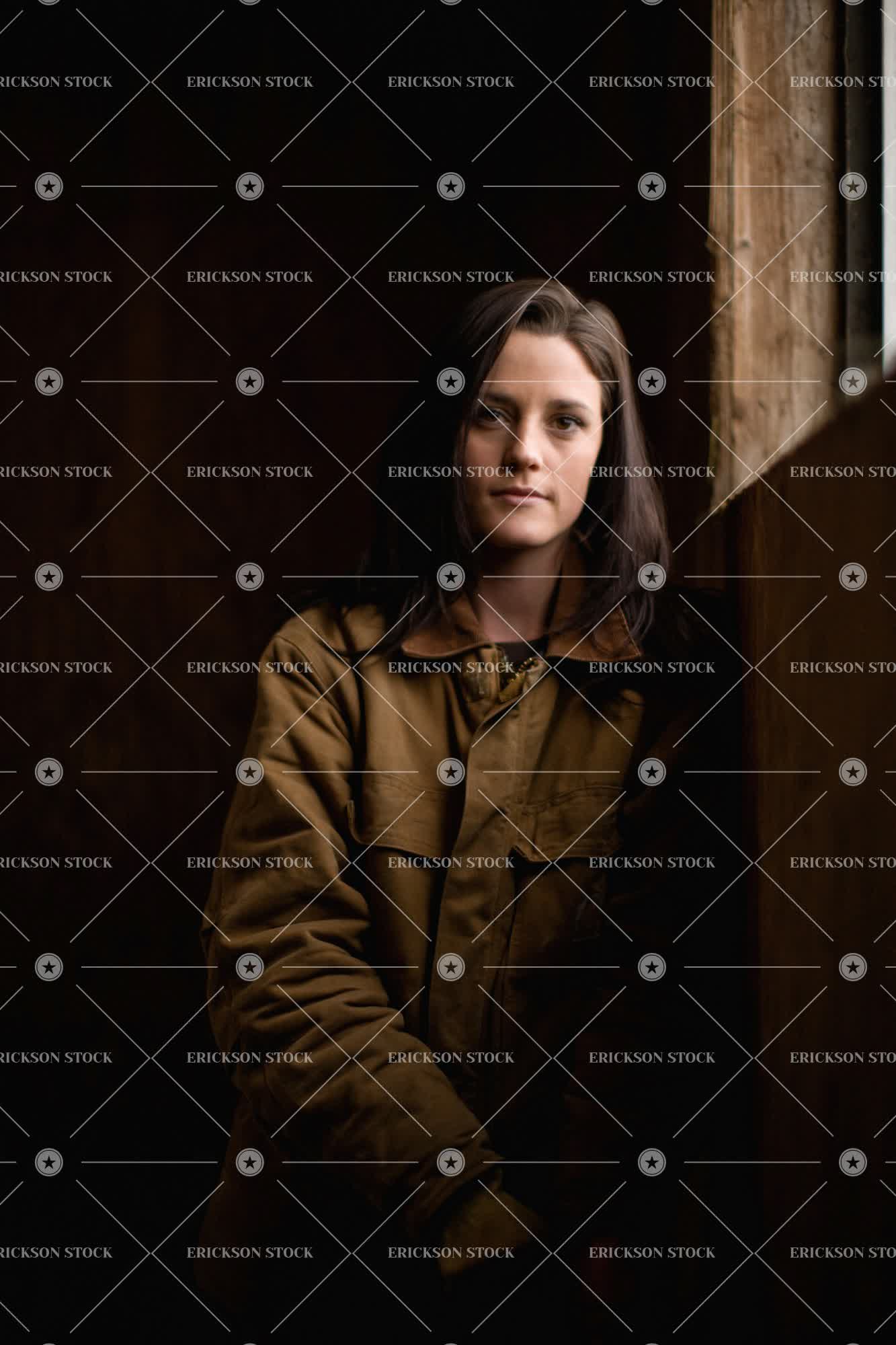 Tags adult, barn, brunette, caucasian, coat, day, Eye contact, farm, farm building, farm buildings, farms, female, half length, indoor, indoors, inside, Jacket, jackets, look at camera, looking at camera, one person, person, portrait, Portraits, selective focus, stable, stables, vertical, waist up, woman, young adult