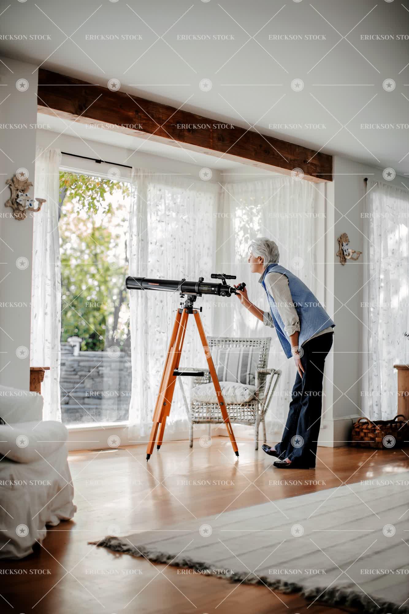 Mature woman looking through a telescope from her living room.