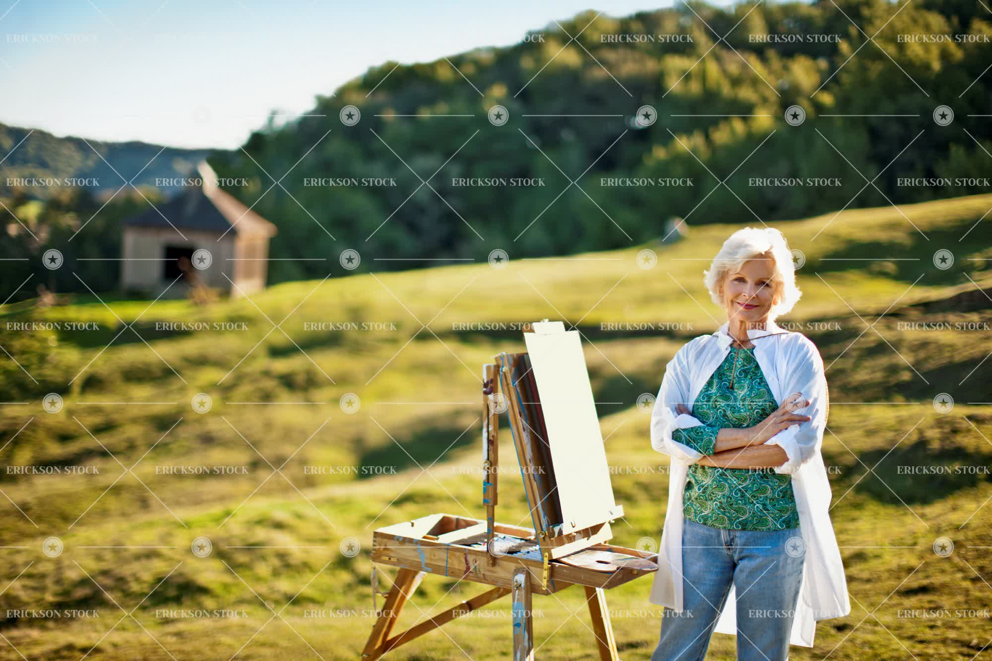 Tags adult, arms crossed, art, artistic, artwork, blond, blouse, blue jeans, casual clothes, caucasian, content, country, countryside, create, day, denim, easel, easels, Eye contact, female, field, fields, folded arms, grass, Grassland, grasslands, grassy, hill, hills, hobbies, hobby, horizontal, jeans, leisure, leisure activities, leisure activity, look at camera, looking at camera, mature adult, Meadow, meadows, one person, outdoor, outdoors, outside, paddock, paddocks, paint, paint brush, paint brushes, paintbrush, paintbrushes, painting, paintings, paints, pasture, pastures, people, person, pleased, portrait, Portraits, recreation, recreational pursuit, recreational pursuits, rural, scenery, scenic, scenics, selective focus, senior adult, short hair, smock, smocks, stand, standing, stands, three quarter length, top, tops, Tree, trees, weekend activities, weekend activity, woman
