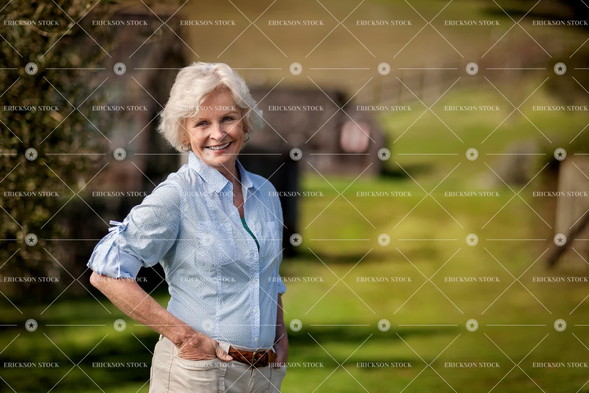 Tags adult, belt, button down shirt, caucasian, cheerful, collared shirt, country, countryside, delight, enjoyment, female, focus on foreground, grey hair, half length, hand in pocket, hands in pockets, happiness, happy, horizontal, joy, joyful, lush, mature adult, non-urban, one person, outdoor, outdoors, outside, Pants, people, person, rural, rural life, selective focus, senior adult, shirt, shirts, smile, smiling, Tree, trees, trousers, waist up, white hair, woman