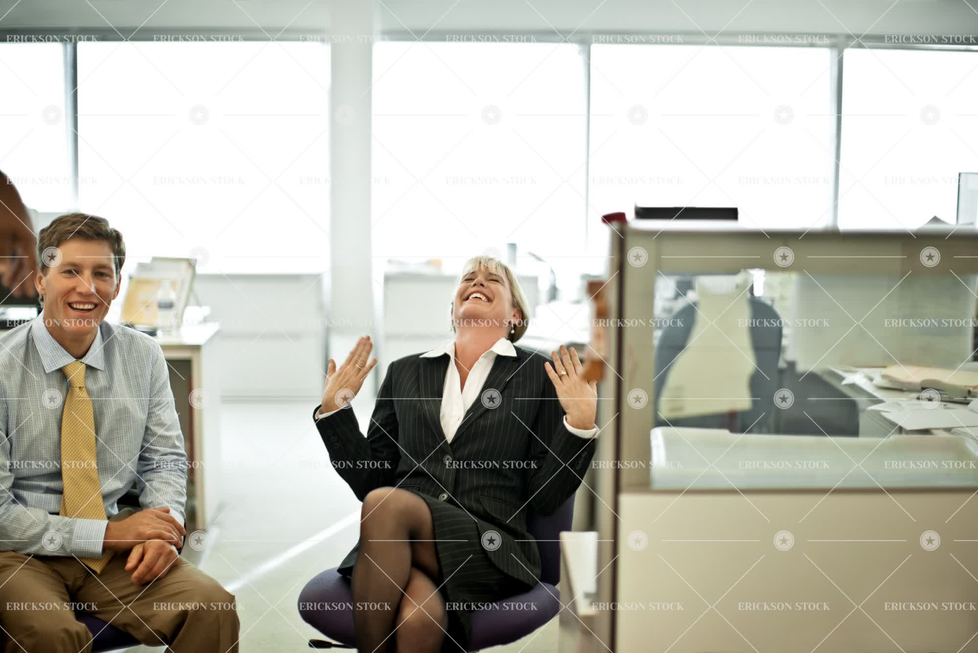 Tags adult, at work, bangs, blazer, blond, brunette, business, business man, business woman, button down shirt, caucasian, chair, cheerful, closed eyes, collared shirt, colleague, conversation, cubicle, delight, desk, document, earrings, enjoyment, executive, executives, Eye contact, eyes closed, female, file, files, folder, folders, fringe, Furniture, gesture, gestures, Gesturing, gossip, gossiping, gossips, gossipy, grin, grinning, grins, hair back, hair tied up, hands raised, happiness, happy, horizontal, indoor, indoors, inside, Jacket, jackets, jewellery, joy, joyful, laughing, leaning back, look at camera, looking at camera, male, man, mature adult, mid adult, office, office chair, office chairs, office worker, office workers, offices, paper, papers, paperwork, partition, partitions, people, person, place of work, seat, seated, seats, selective focus, shirt, shirts, sitting, skirt, skirts, smile, smiling, speak, speaking, speaks, stockings, table, Tables, talk, talking, talks, three quarter length, tie, ties, tights, toothy smile, two people, well-dressed, white collar worker, white collar workers, window, windows, woman, work, worker, working, young adult
