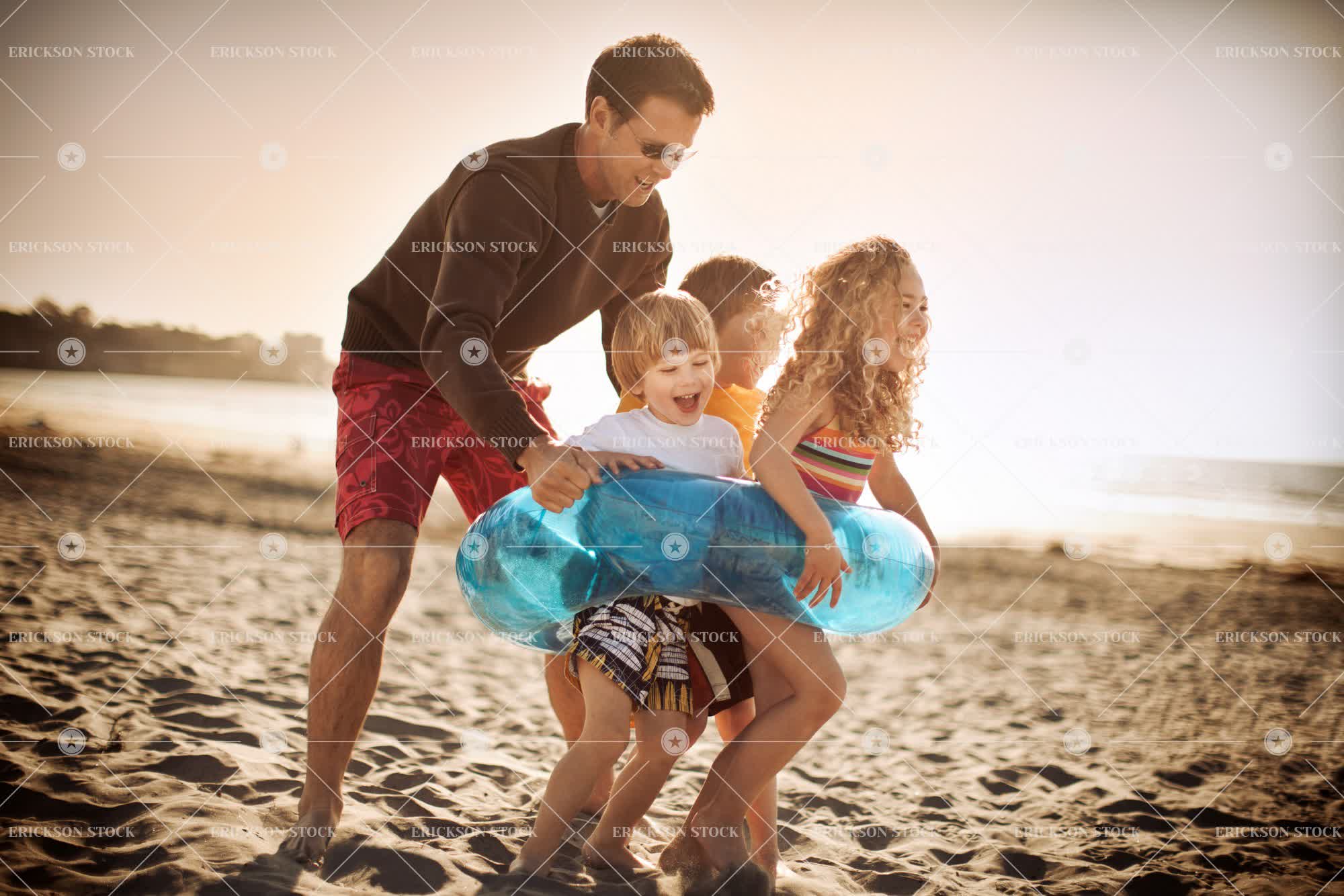 Man chases and plays with three young children in an inner tube on a sandy beach.