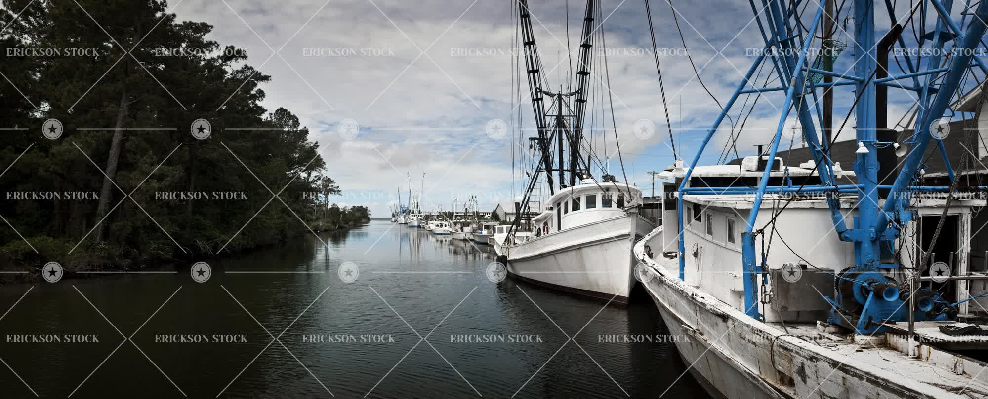 Fishing boats moored in a lake.
