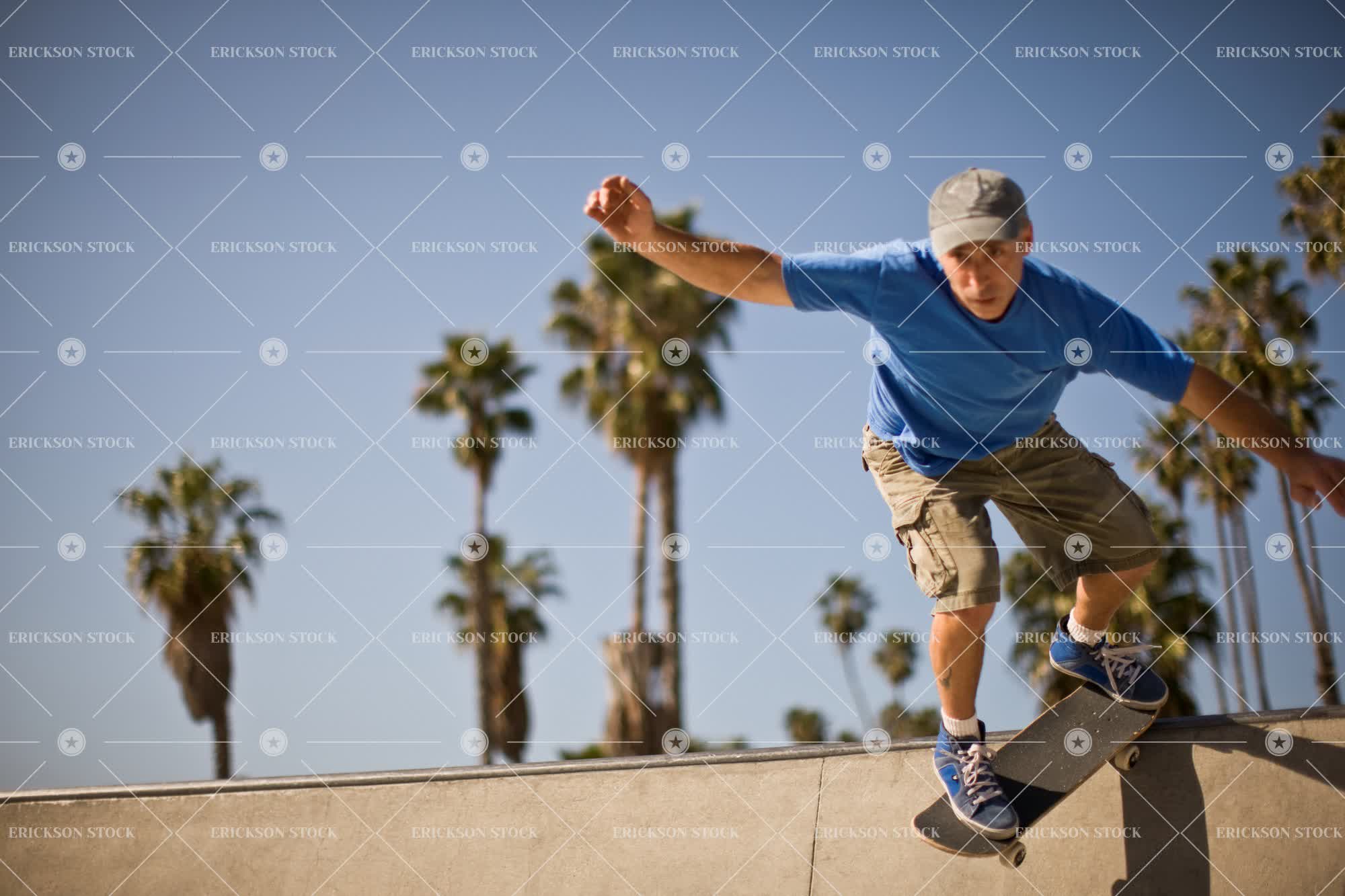 Tags adult, at the edge, balance, blue sky, caucasian, clear sky, cool, copy space, copy space top, day, edge, Effort, enjoyment, focus on foreground, full length, Fun, having fun, horizontal, individuality, leisure, leisure activities, leisure activity, male, man, mature adult, mid adult, motion, negative space, negative space top, one person, outdoor, outdoors, outside, palm, palm tree, palm trees, palms, Park, parks, people, person, recreation, recreational pursuit, recreational pursuits, selective focus, skate park, skate parks, skate ramp, skate ramps, skateboard, skateboard bowl, skateboard bowls, skateboard park, skateboard parks, skateboard ramp, skateboard ramps, skateboarder, skateboarders, skateboarding, skateboards, sport, Tree, trees, young adult